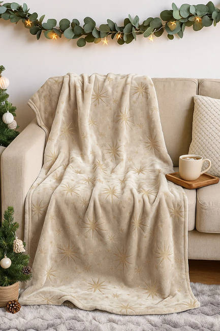Koc świąteczny pluszowy w złote gwiazdki 160x200 kremowy ecru
