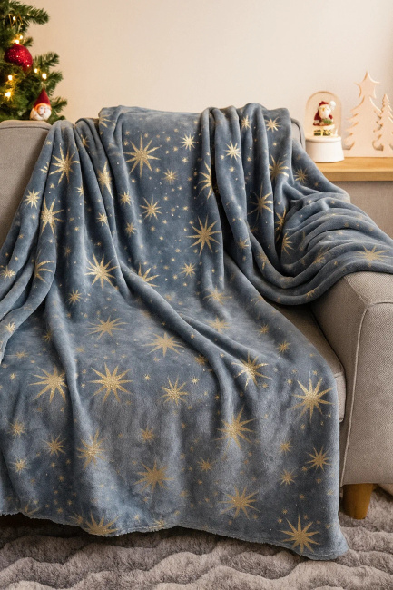 Koc świąteczny pluszowy w złote gwiazdki 160x200 jasny szary