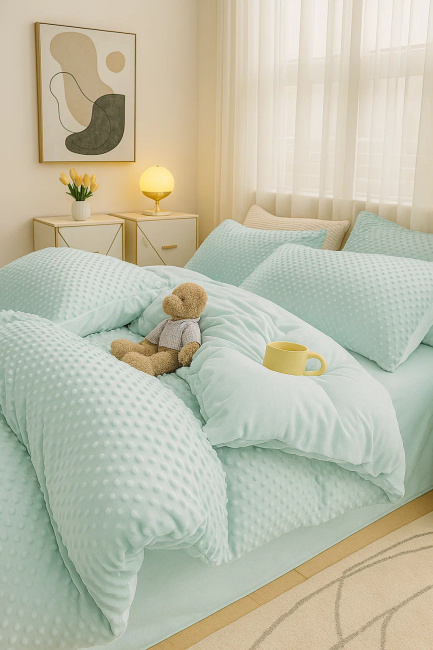 Pościel pluszowa zimowa miś w kropki 3D 200x220 3 el. MINKY miętowa nr514