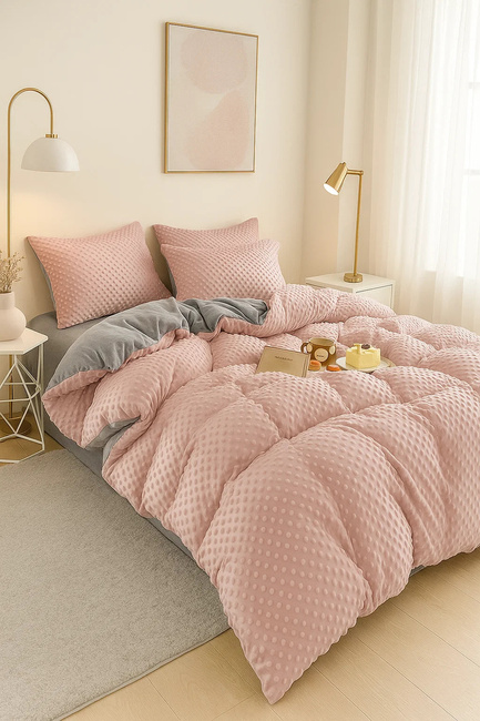 Pościel pluszowa welurowa zimowa miś gładka 200x220 3 el. różowa - szara
