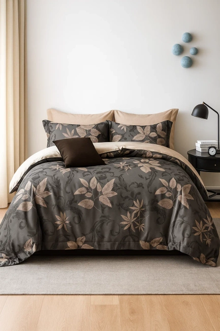Pościel ciemna szara w liście 200x220 4 el. Anserma C-099