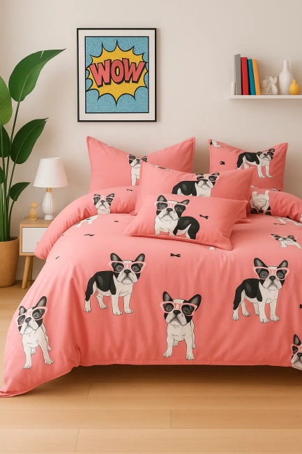 Pościel dziecięca młodzieżowa różowa w buldogi francuskie 160x200 3 el. nr376