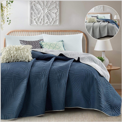 Kołdra letnia narzuta ozdobna dwustronna DIAMOND 160x200 niebieska w kwiaty - jasna szara nr422
