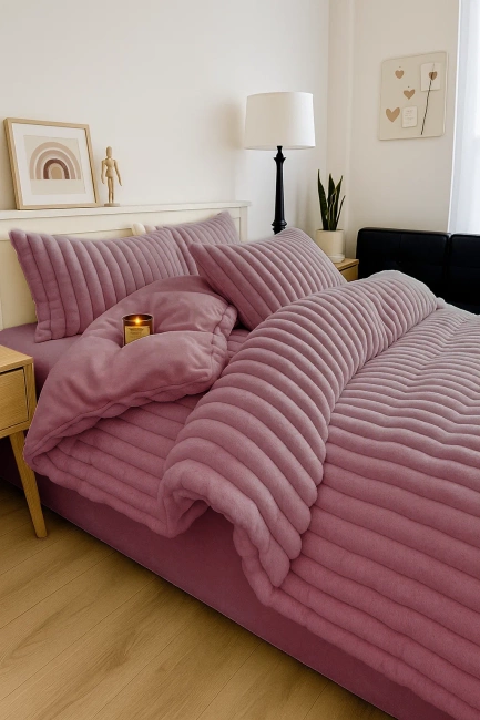 Pościel pluszowa zimowa miś tłoczona w grube szerokie pasy 160x200 3 el. różowa