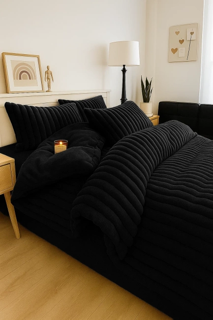 Pościel pluszowa zimowa miś tłoczona w grube szerokie pasy 160x200 3 el. czarna