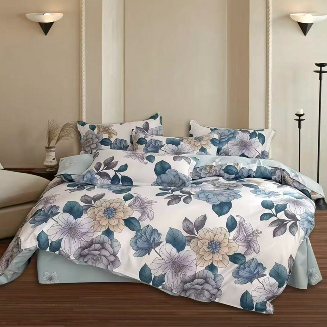 Pościel biało-błękitna w kwiaty 160x200 4 el. Palmira C-3