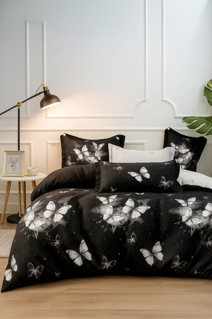 Pościel czarna w motyle 160x200 4 el. z prześcieradłem z gumką Quito D-133