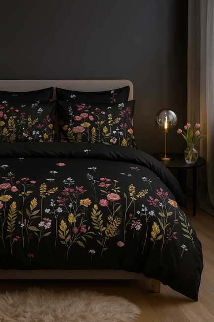 Pościel czarna w kwiaty 200x220 3 el. A084