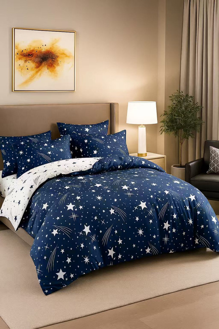 Pościel granatowa w gwiazdki 200x220 4 el. z prześcieradłem z gumką Night D-002