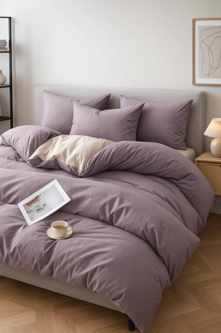 Pościel gładka dwukolorowa 200x220 4 el. z prześcieradłem z gumką jasna fioletowa - kremowa H05