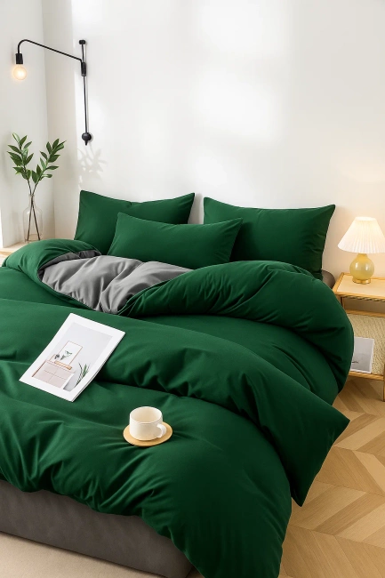 Pościel gładka dwukolorowa 200x220 4 el. z prześcieradłem z gumką butelkowa zielona - ciemna szara H17
