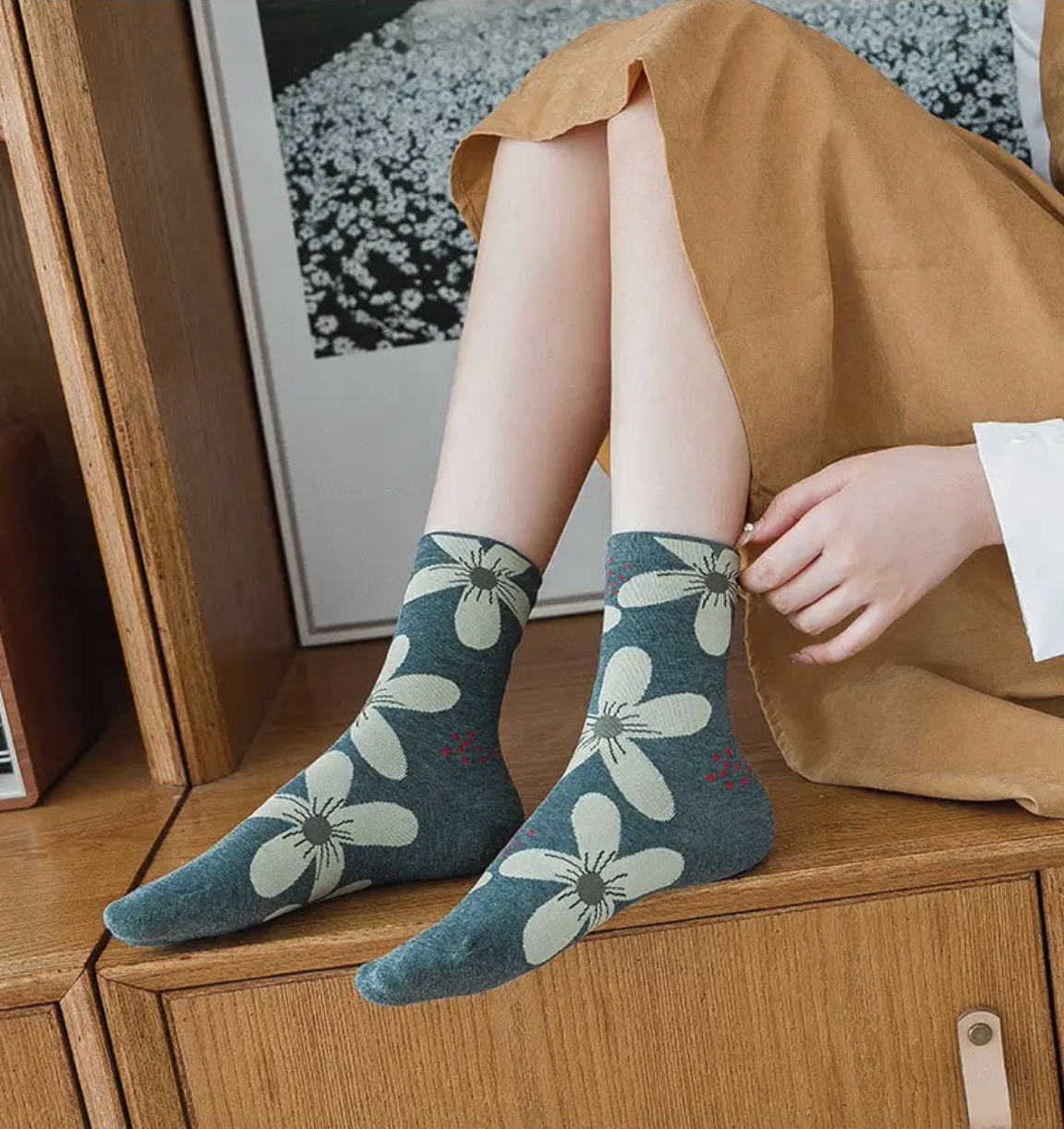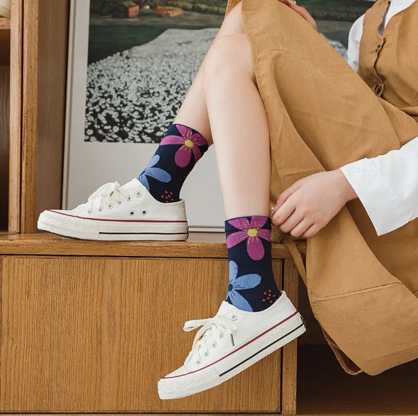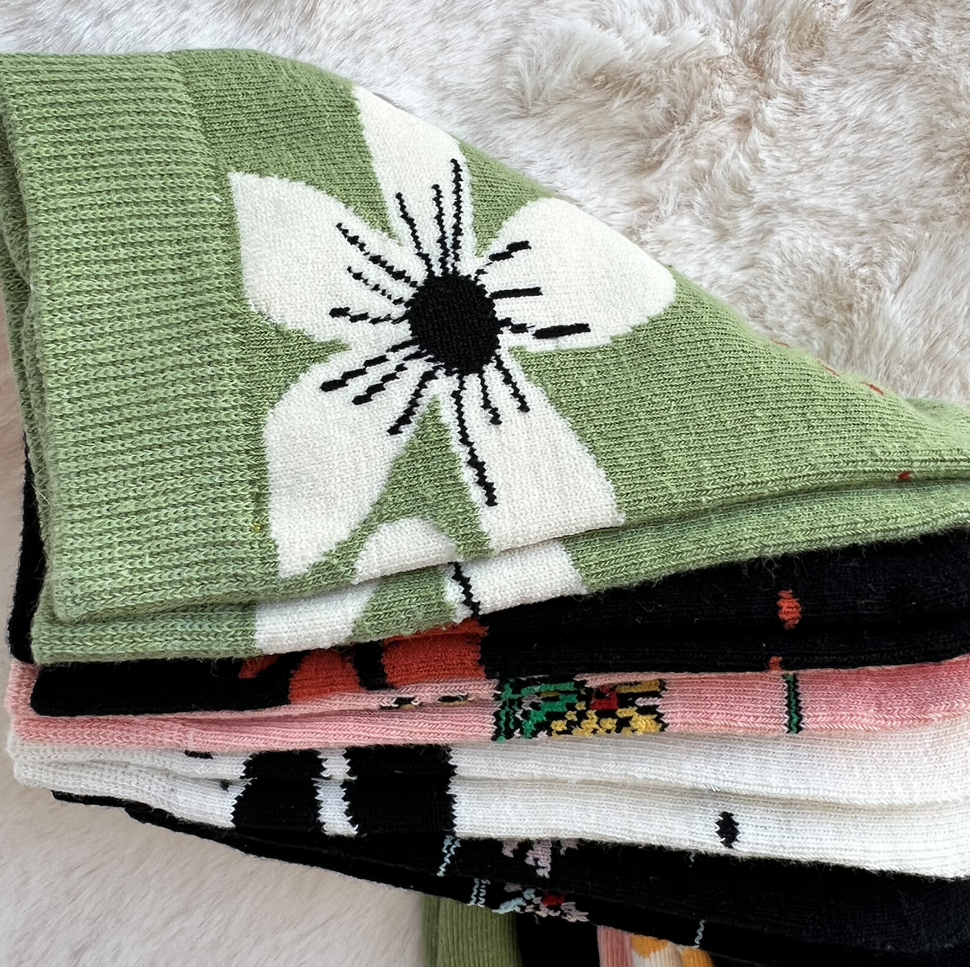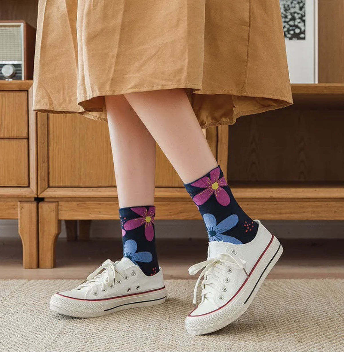 Wygodne skarpetki z elastycznym, szerokim ściągaczem u góry z kolorowymi wzorami kwiatów. Mogą być idealnym akcentem kolorystycznym w każdej stylizacji!