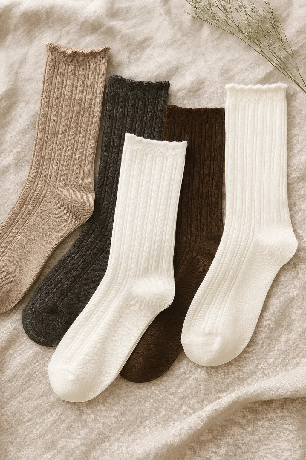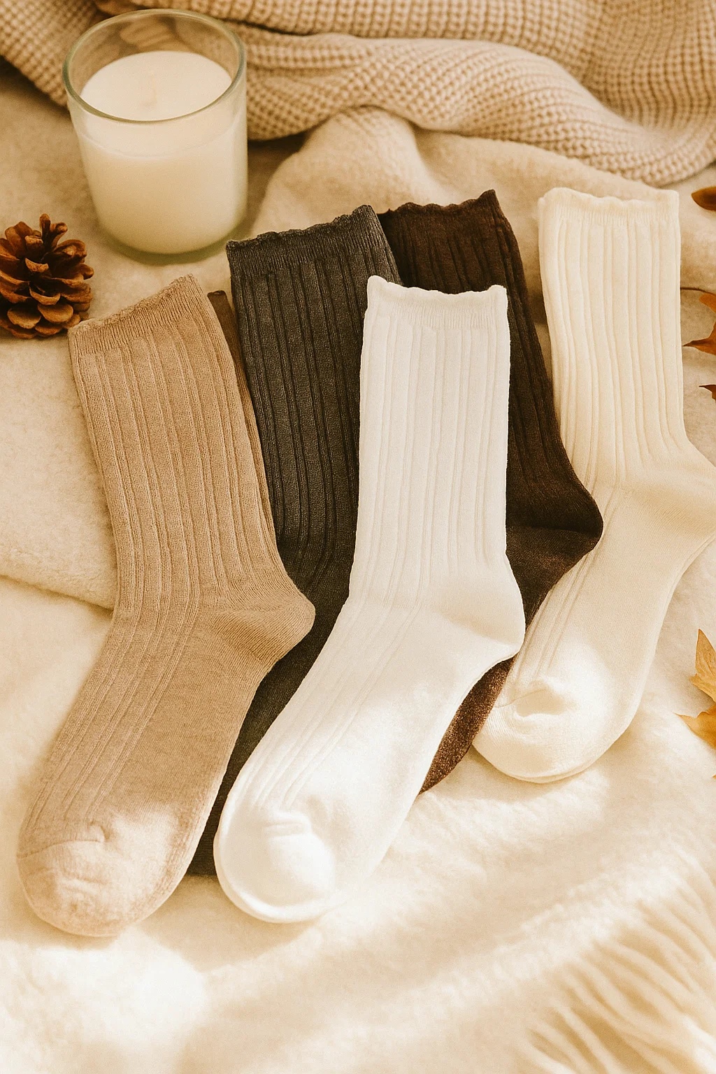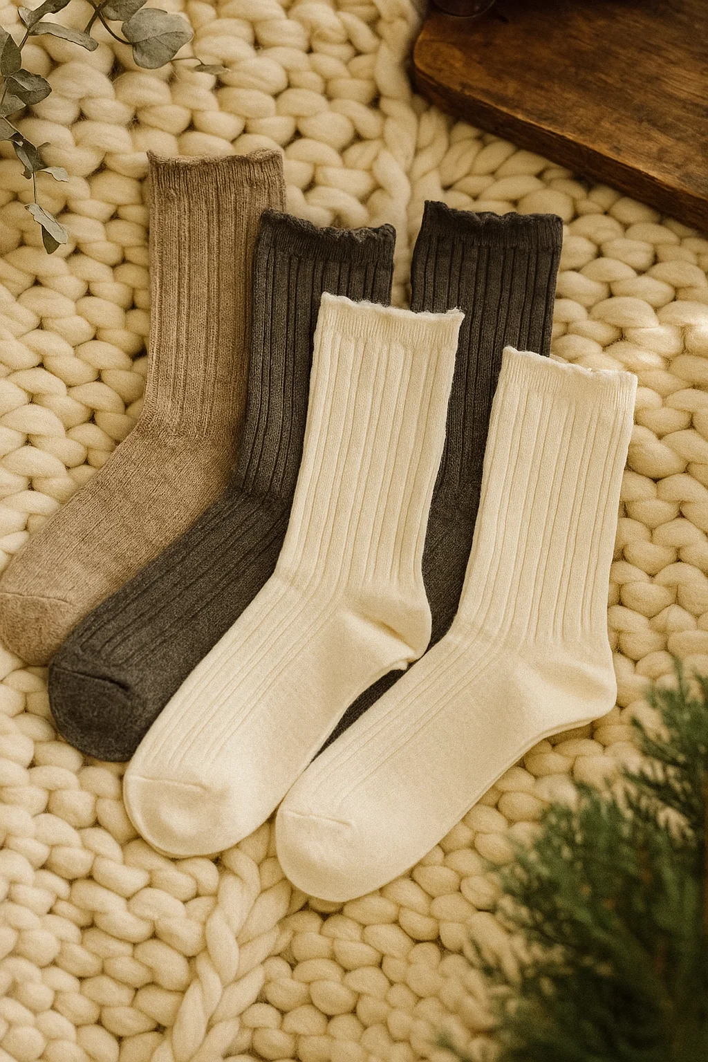• Modne długie skarpety z kaszmiru z falbaną dla kobiet w neutralnych, pięknych kolorach. Zestaw zawiera pięć par. Skarpetk pasujące do wielu stylizacji, z pięknym sweterkowym haftem. Idealne na jesień i zimę. Rozmiar uniwersalny.