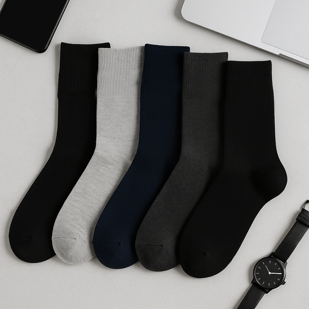 Wygodne skarpetki z bezuciskowym ściągaczem u góry w klasycznych ciemnych kolorach. Pasujące do większości codziennych stylizacji.