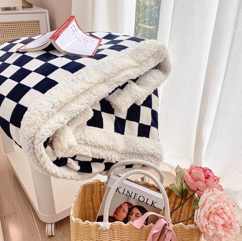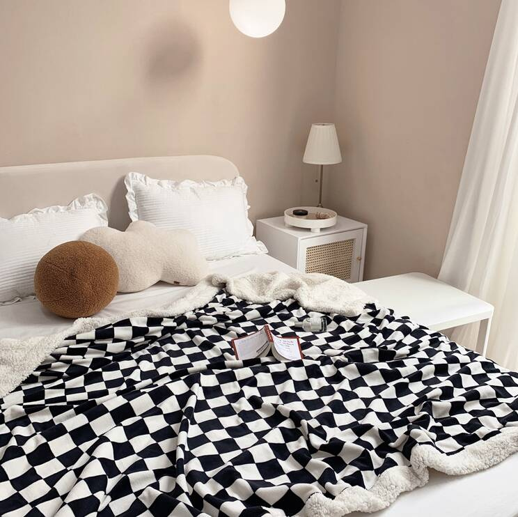 Koc pluszowy narzuta w kratę z barankiem 200x230 czarno-biały