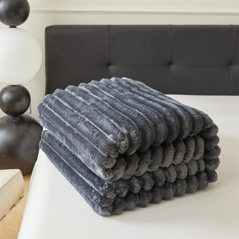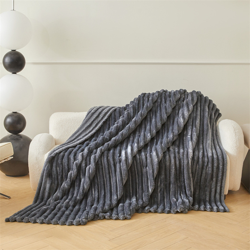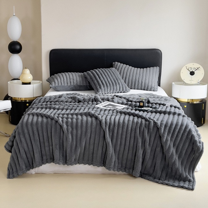 Koc pluszowy tłoczony w grube szerokie pasy 160x200 ciemny szary