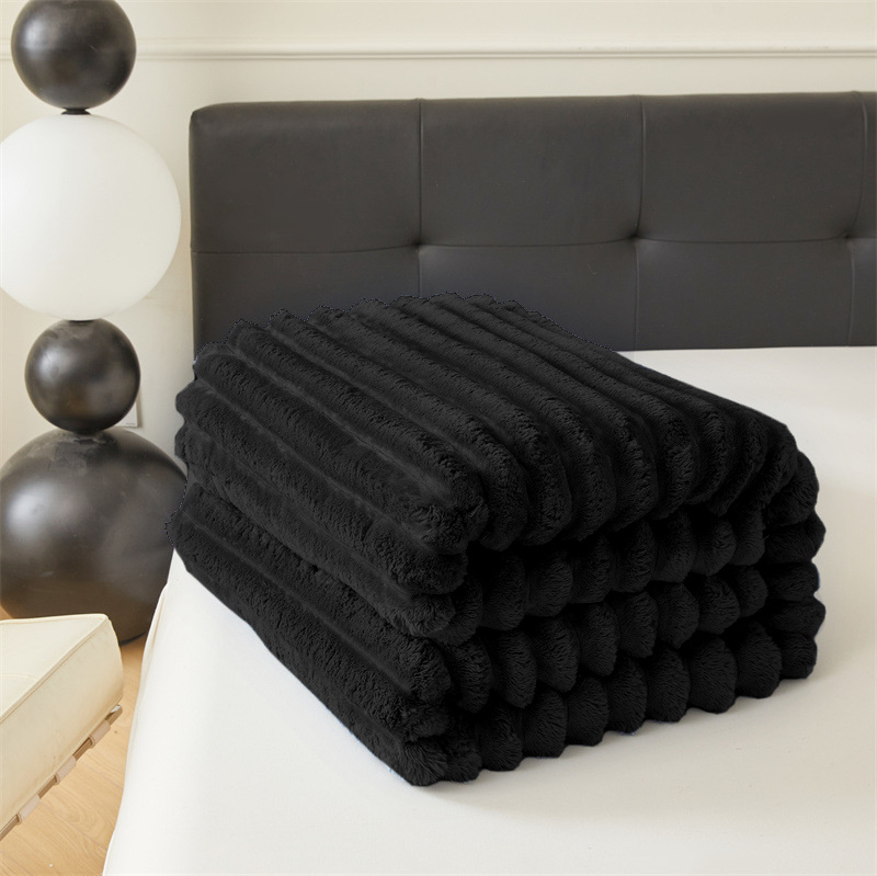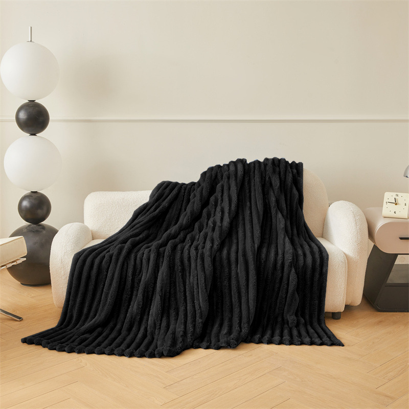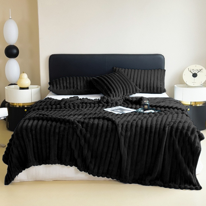 Koc pluszowy tłoczony w grube szerokie pasy 200x220 czarny