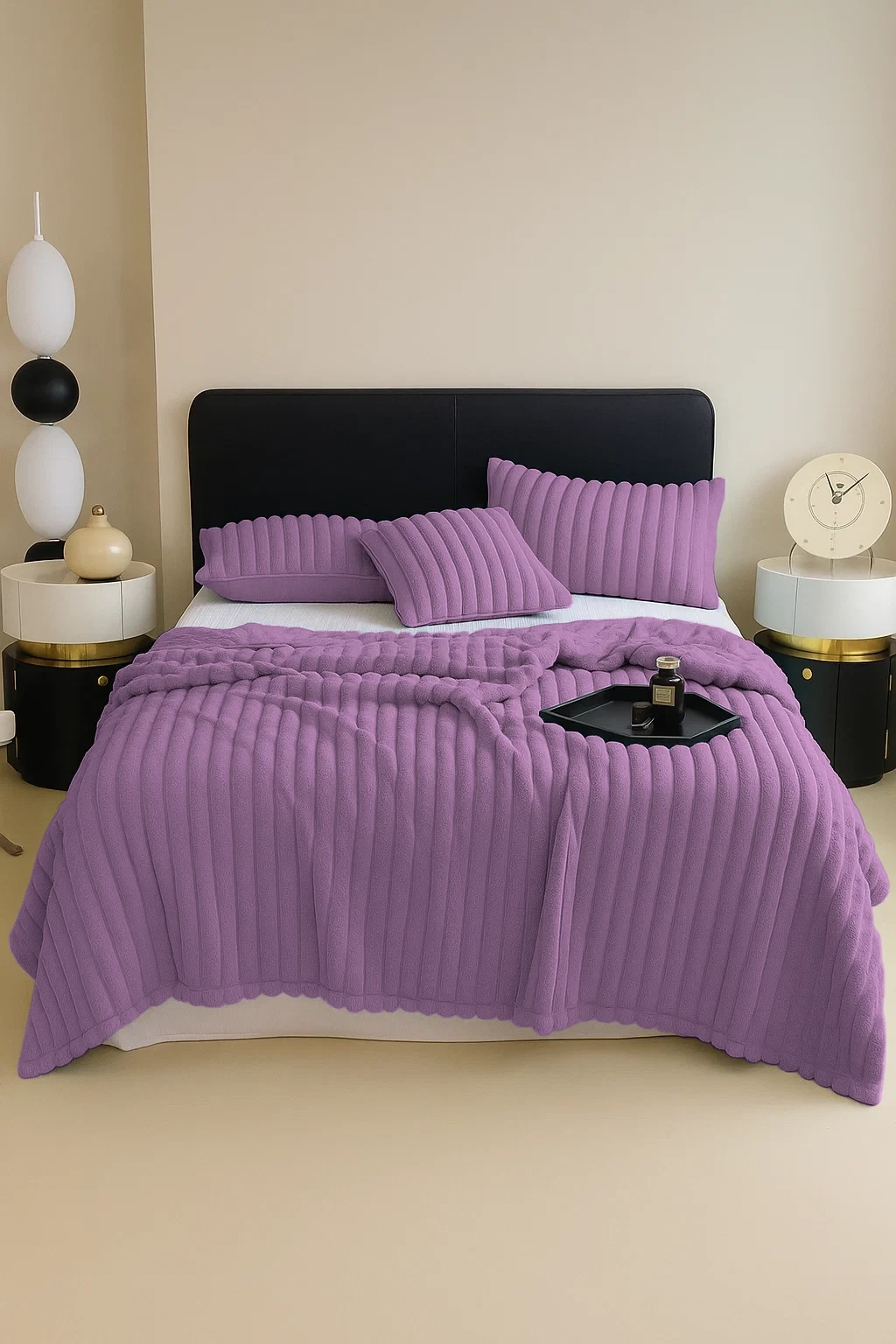 Koc pluszowy tłoczony w grube szerokie pasy 200x220 fioletowy