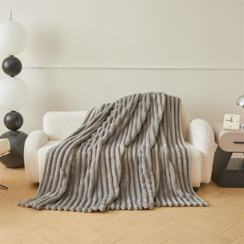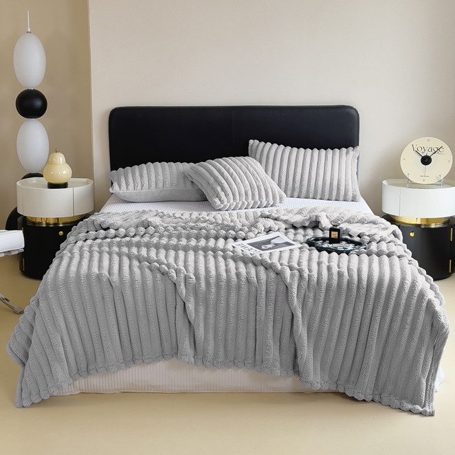 Koc pluszowy tłoczony w grube szerokie pasy 200x220 jasny szary