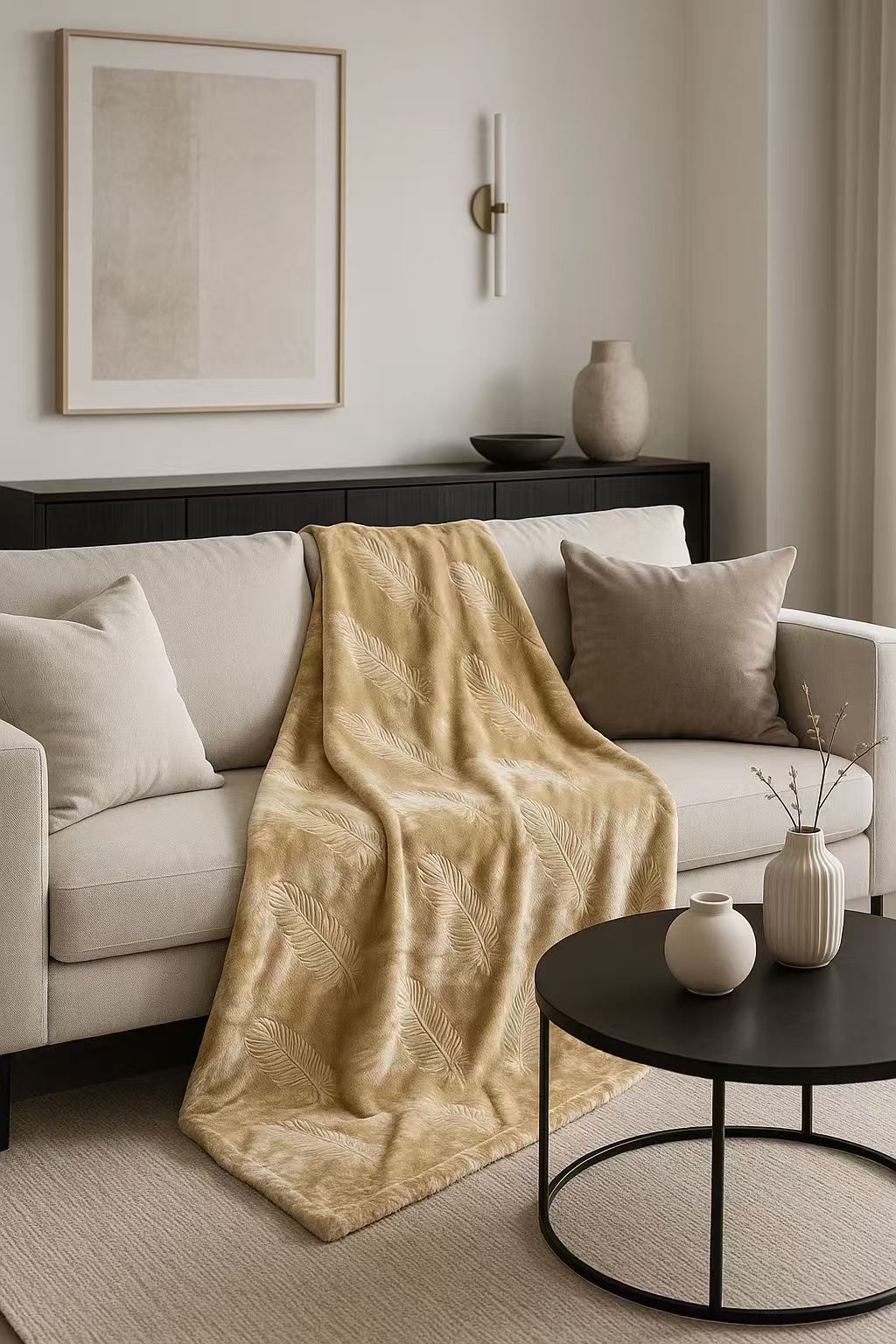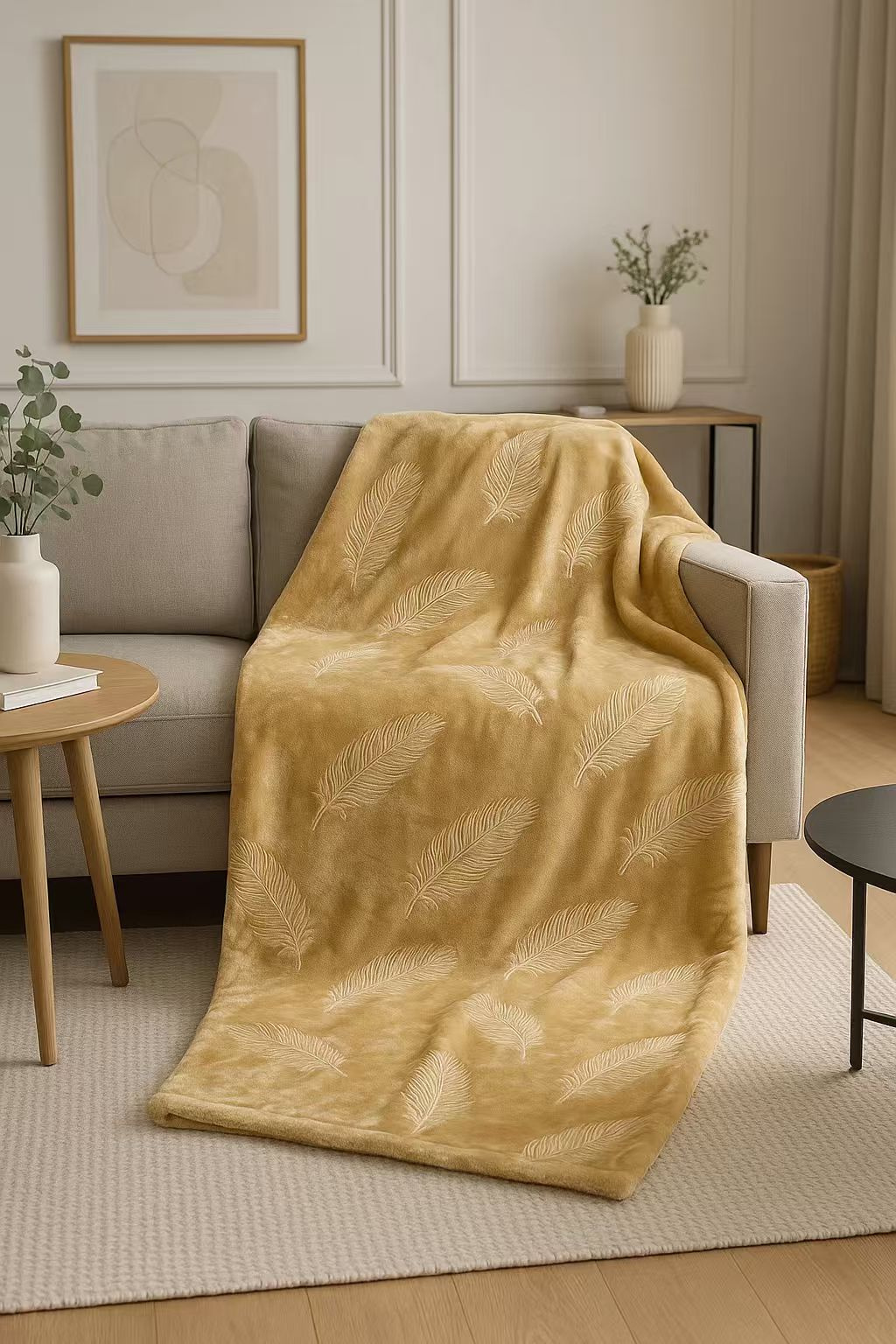 Koc pluszowy tłoczony w piórka 200x220 beżowy