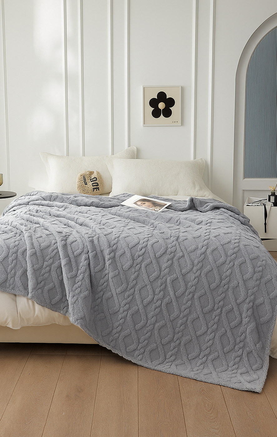 Koc pluszowy tłoczony w sweterek 3D 200x220 jasny szary