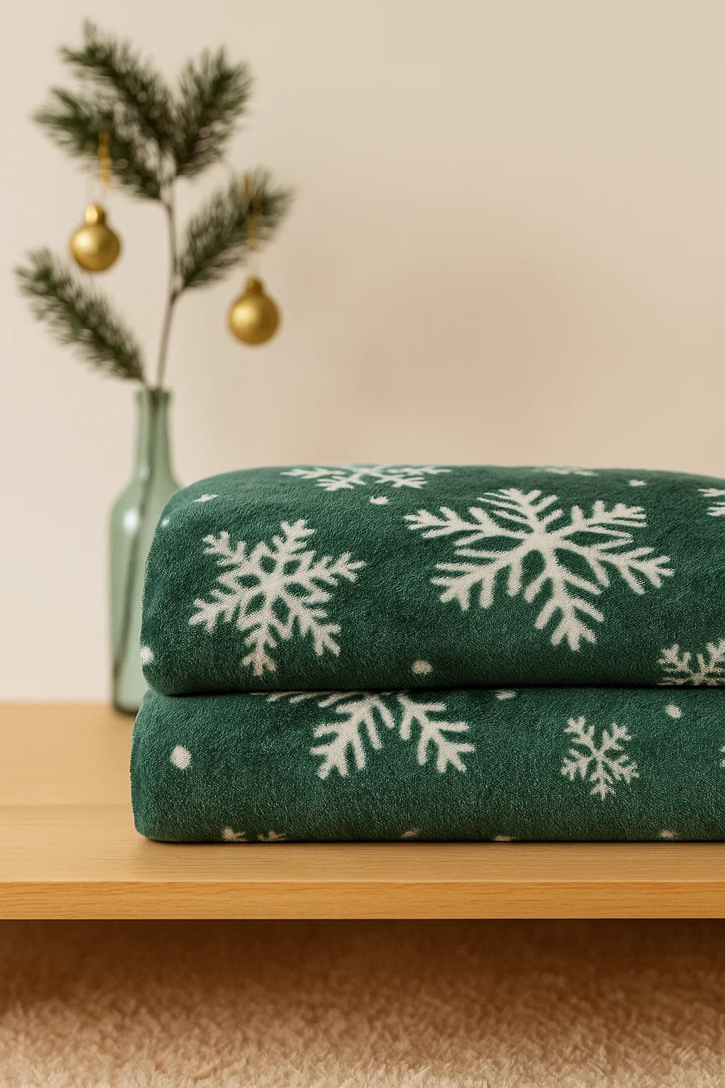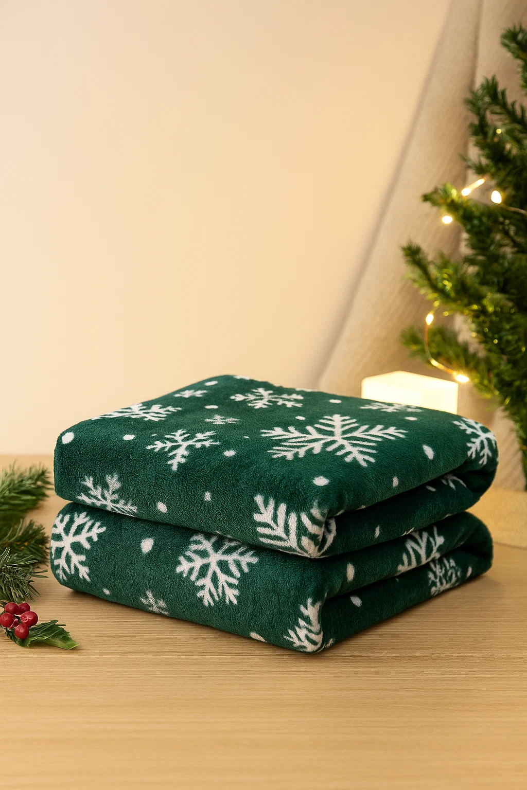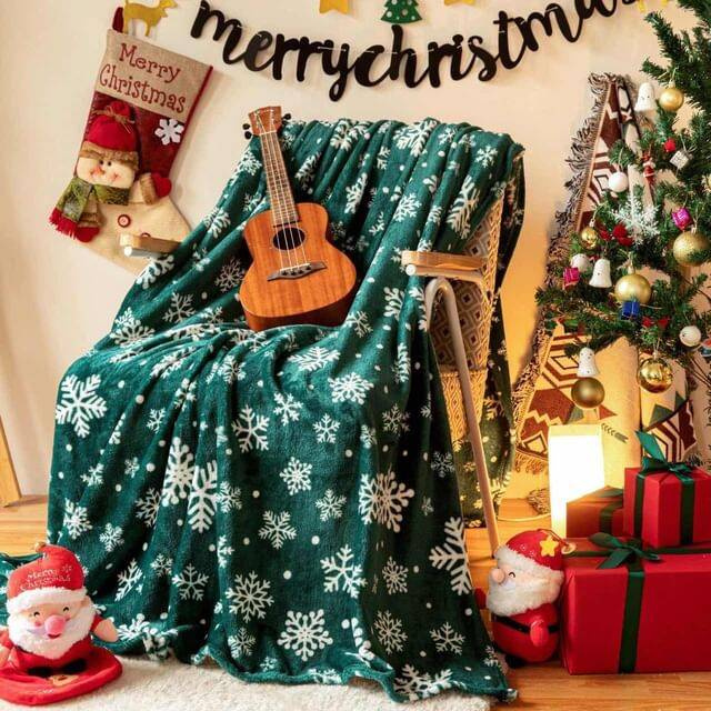 - Mięciutki koc narzuta z mikrofibry, elegancko wykończony i ciepły, idealny na chłodne zimowe wieczory 160x200 świąteczny butelkowy zielony we wzór śnieżynek