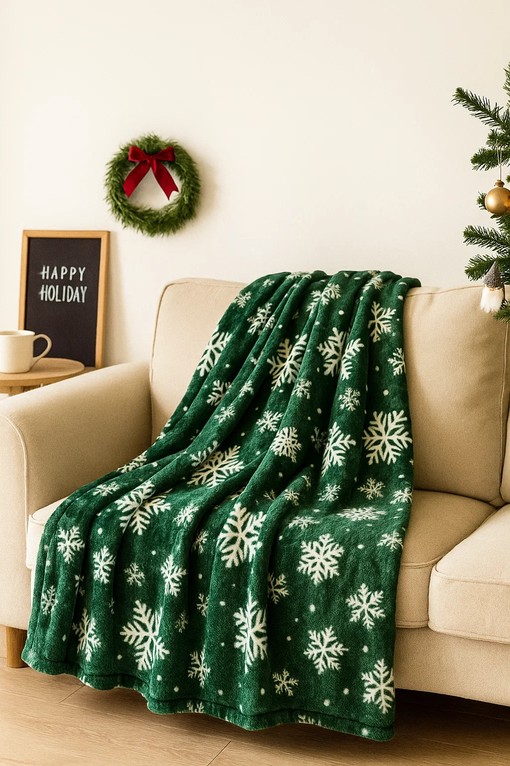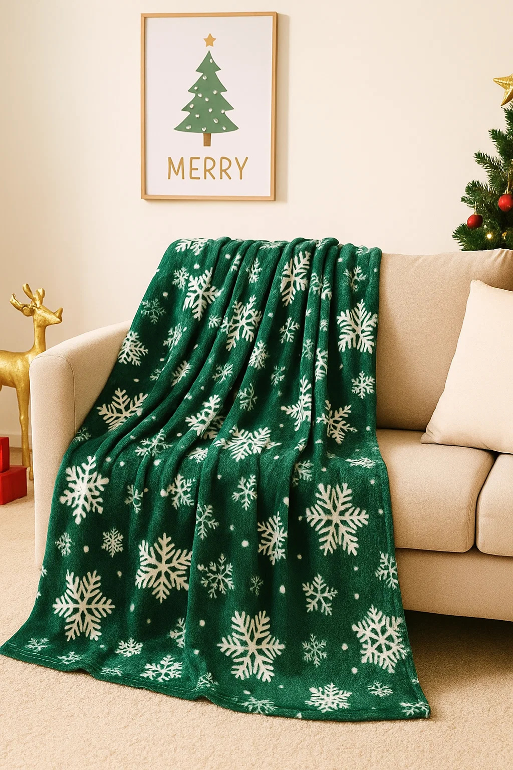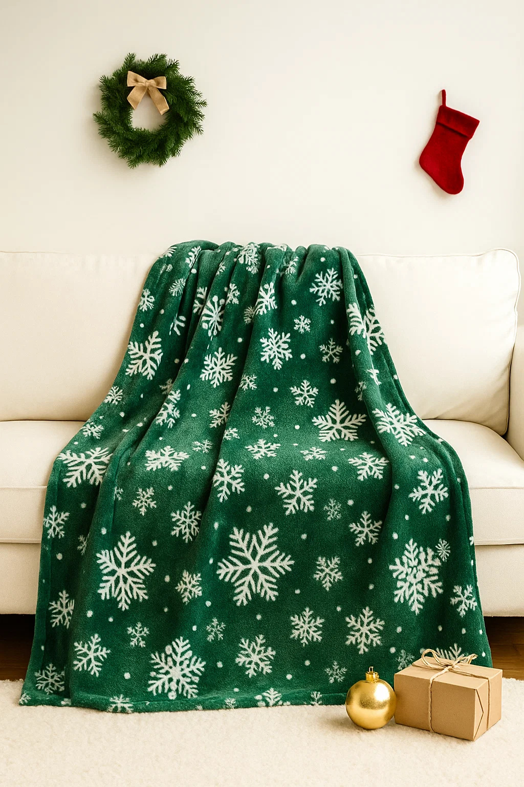 - Mięciutki koc narzuta z mikrofibry, elegancko wykończony i ciepły, idealny na chłodne zimowe wieczory 160x200 świąteczny butelkowy zielony we wzór śnieżynek