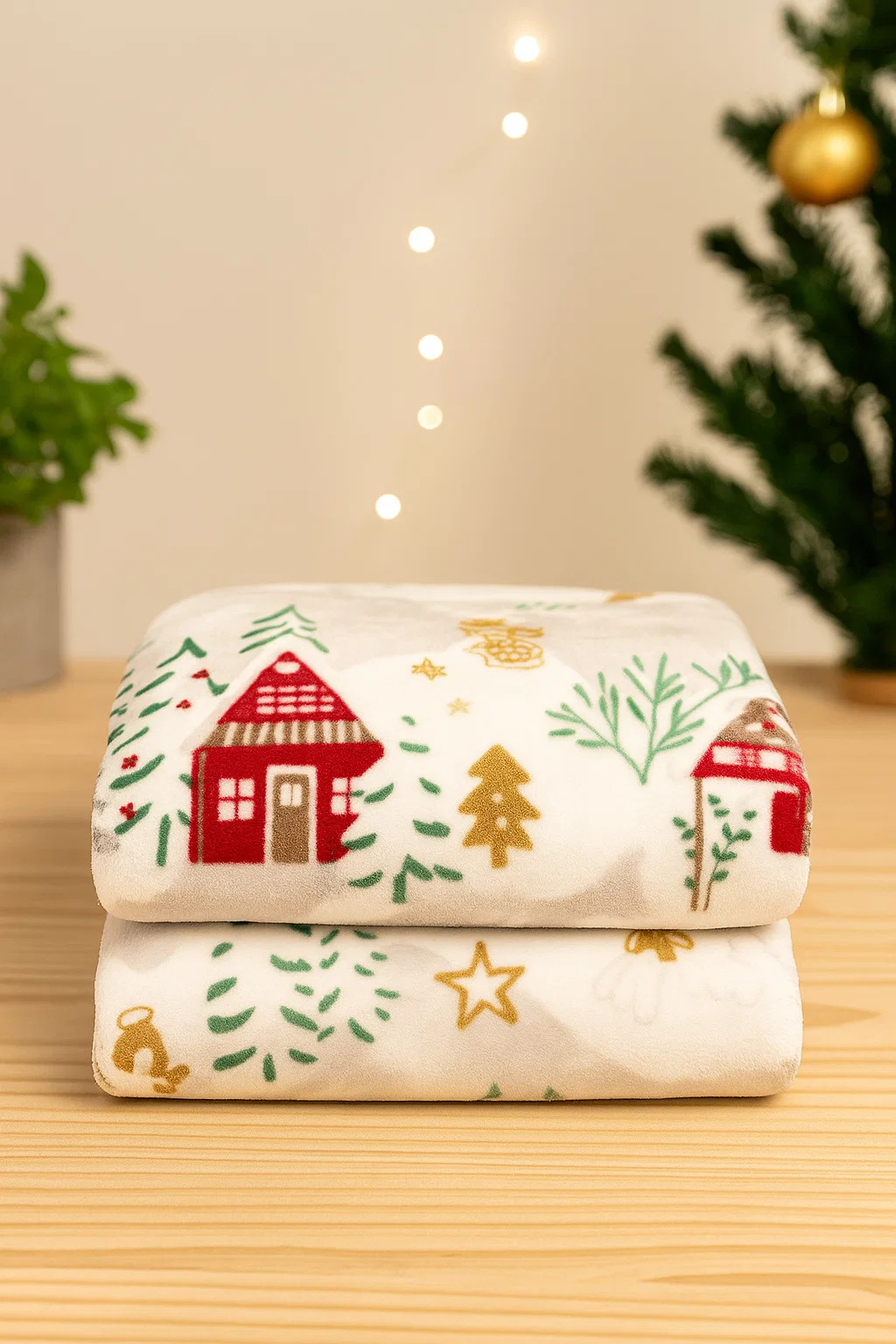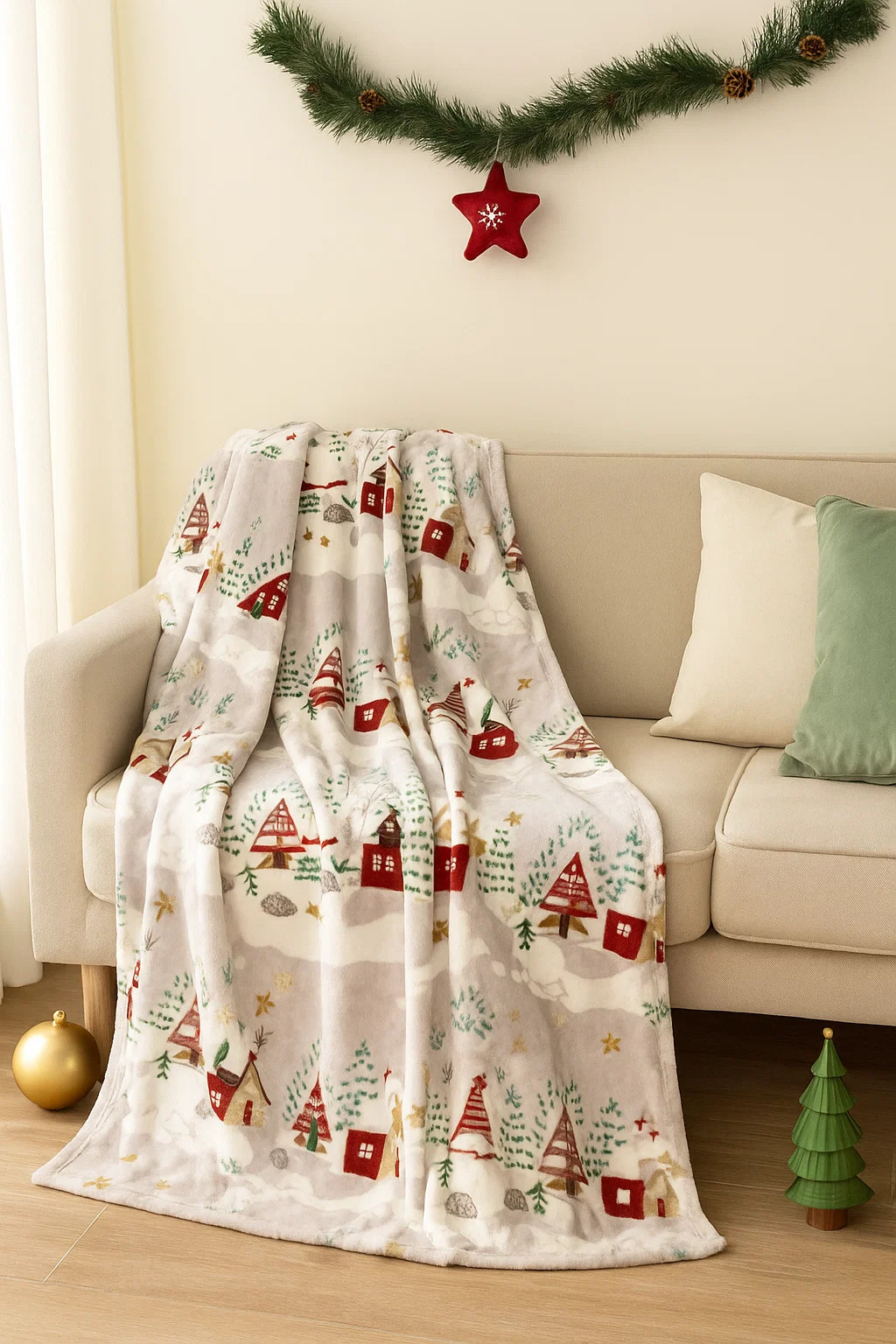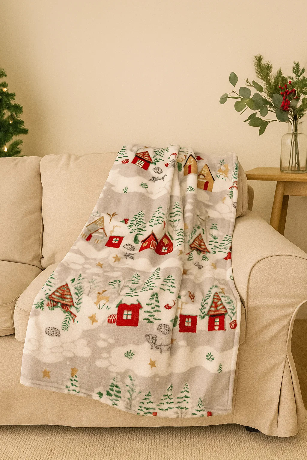 Opinie o Koc świąteczny jasny szary w domki 160x200