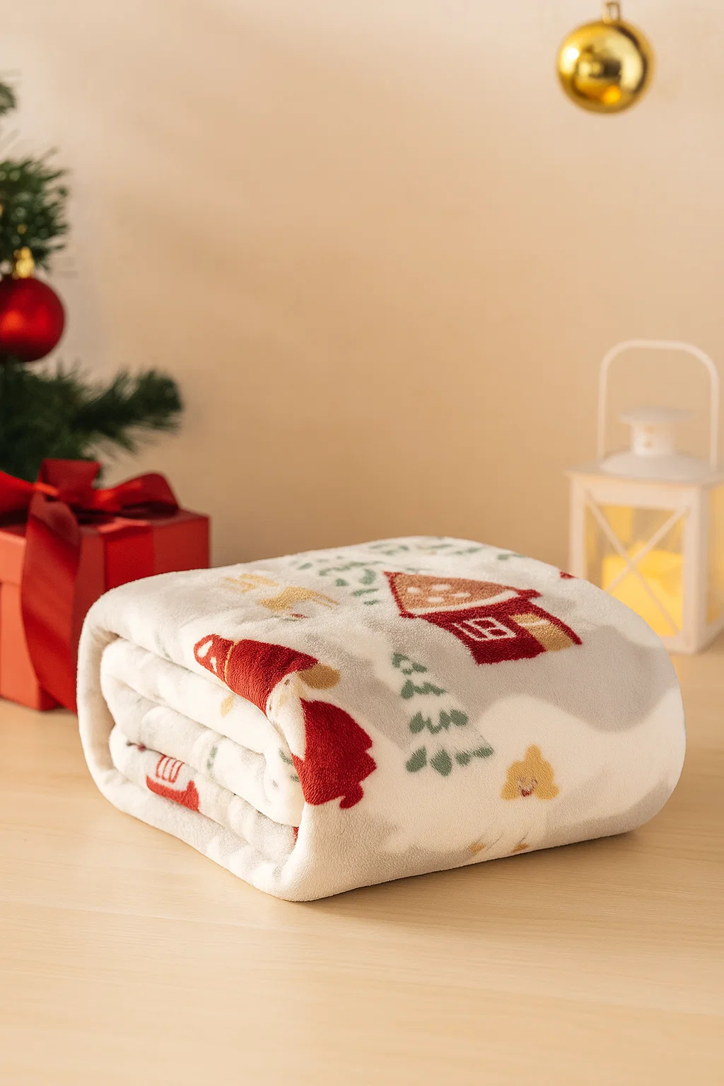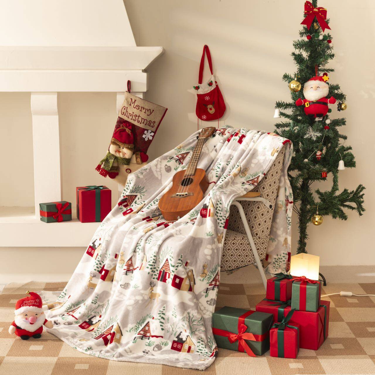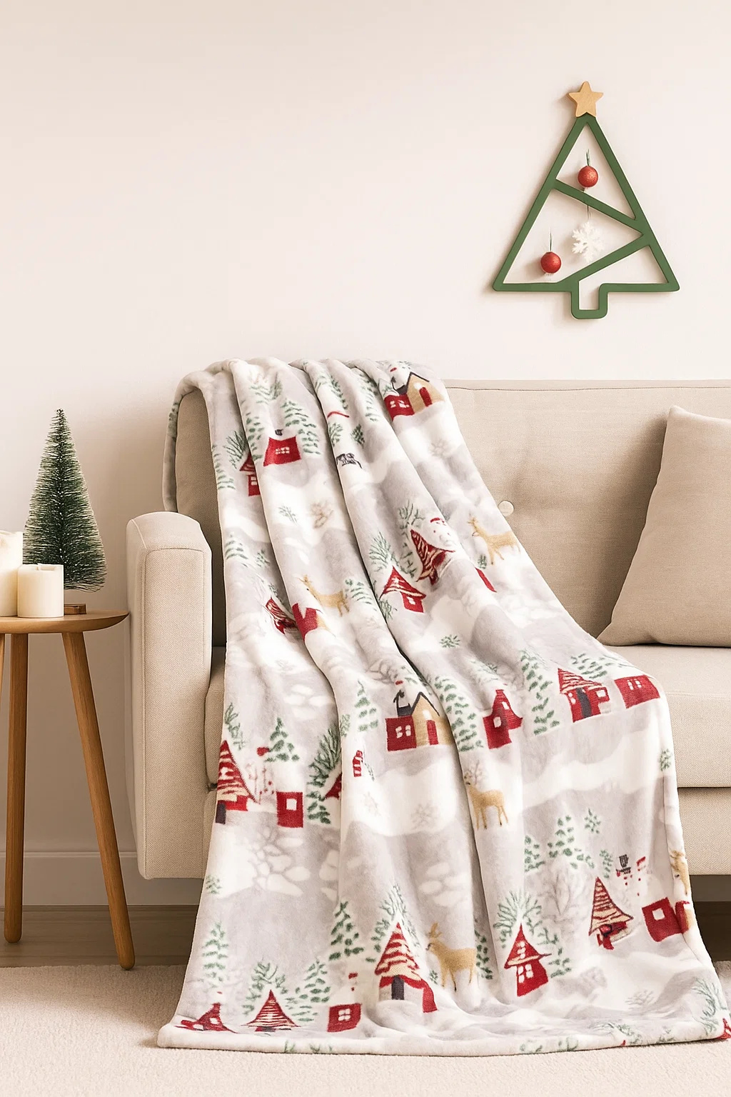 Opinie o Koc świąteczny jasny szary w domki 160x200