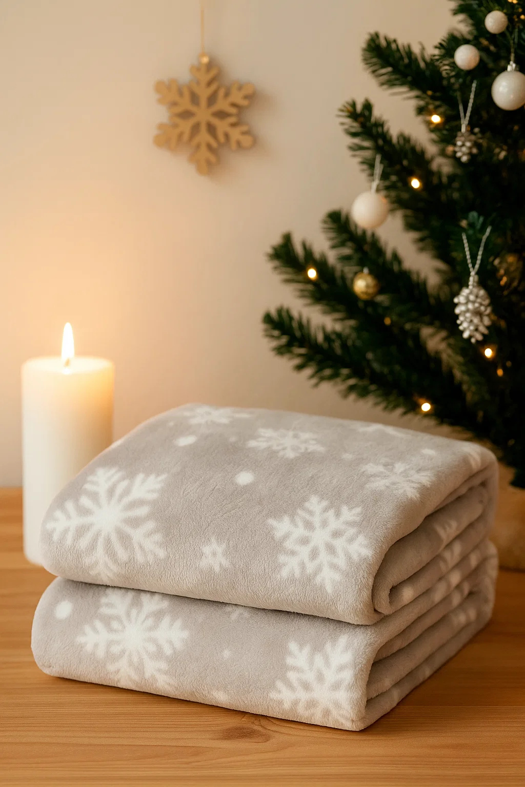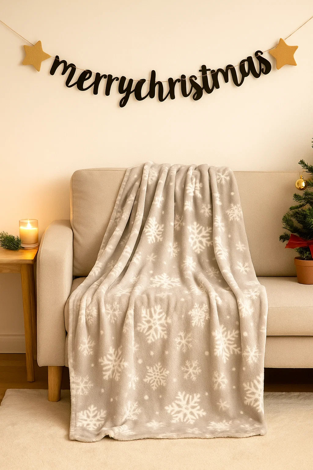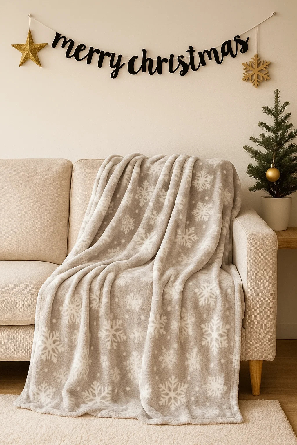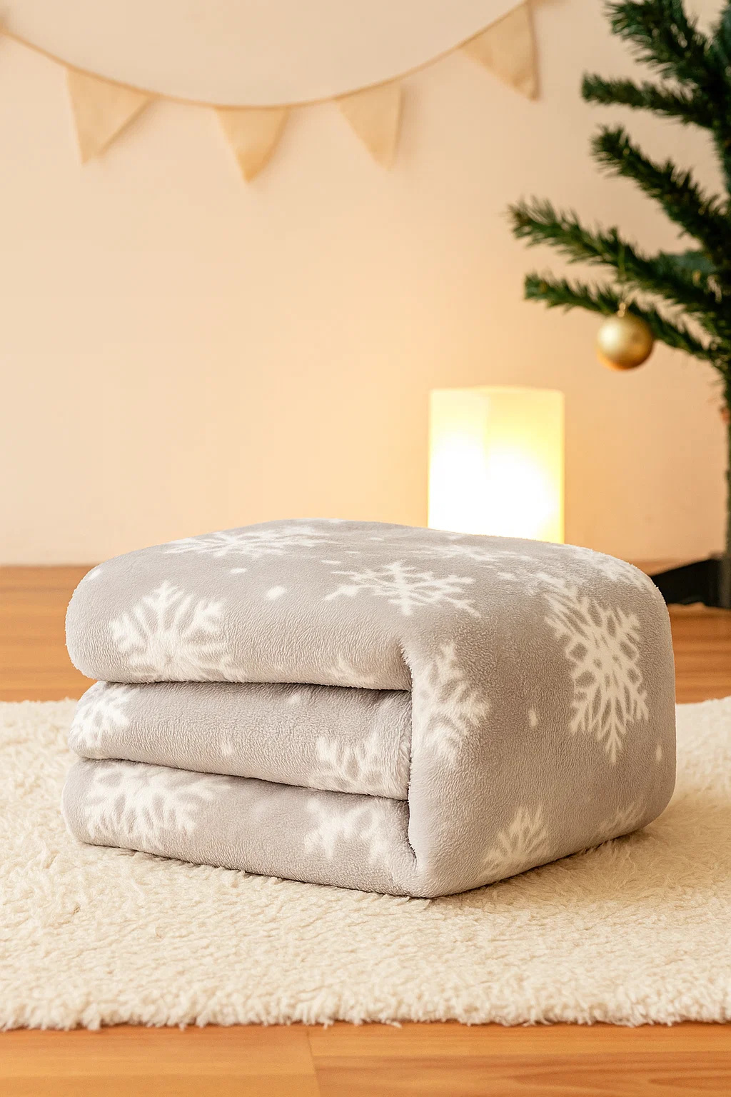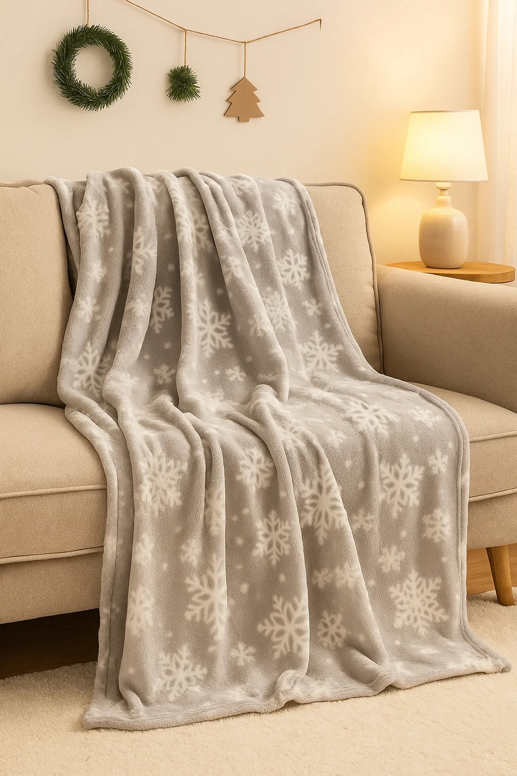 - Mięciutki koc narzuta z mikrofibry, elegancko wykończony i ciepły, idealny na chłodne zimowe wieczory 160x200 świąteczny jasny szary we wzór śnieżynek