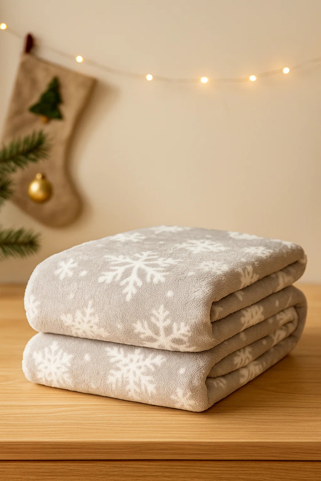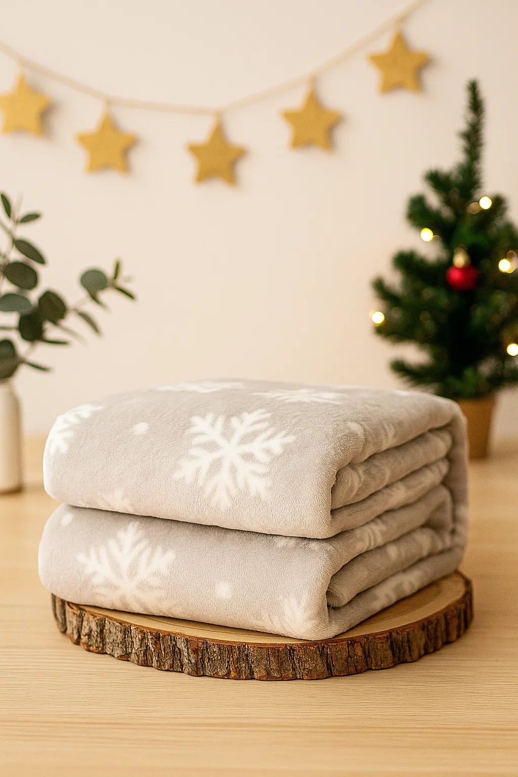 Koc świąteczny jasny szary w śnieżynki 160x200