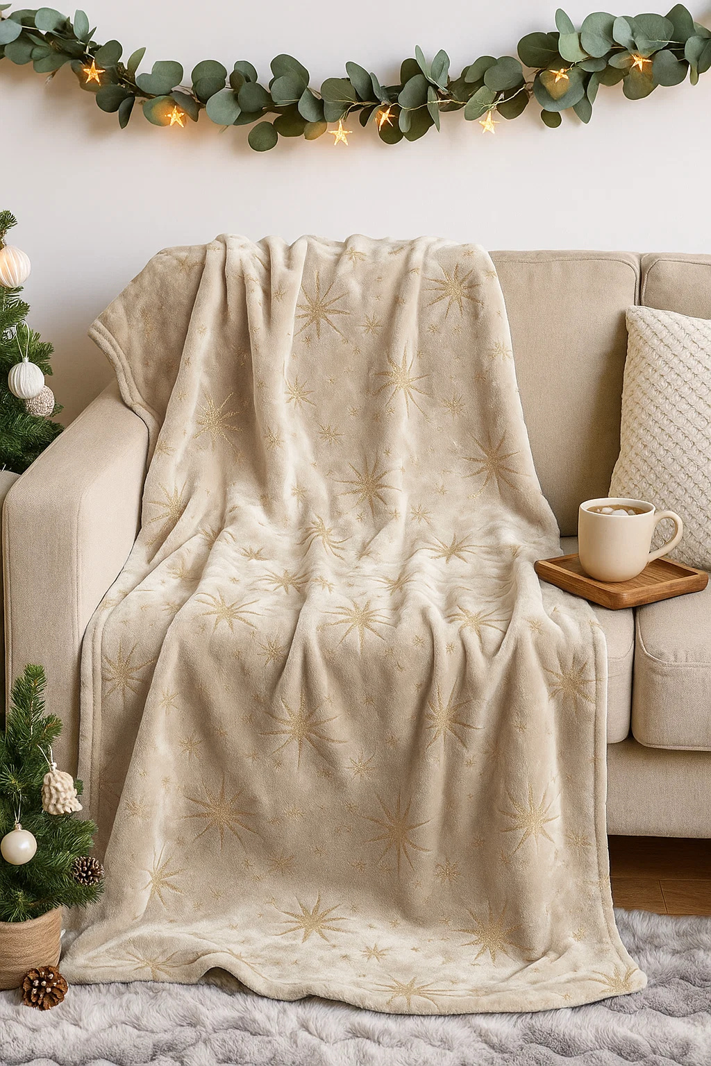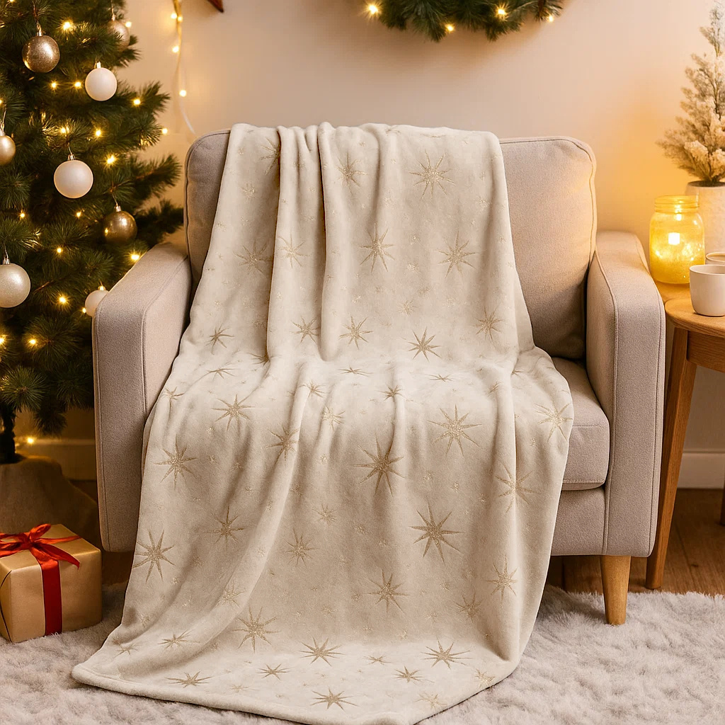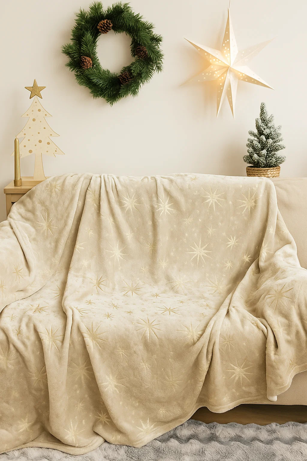• Mięciutki koc narzuta z mikrofibry, elegancko wykończony i ciepły, idealny na chłodne zimowe wieczory 160x200 świąteczny beżowy we wzór gwiazdek