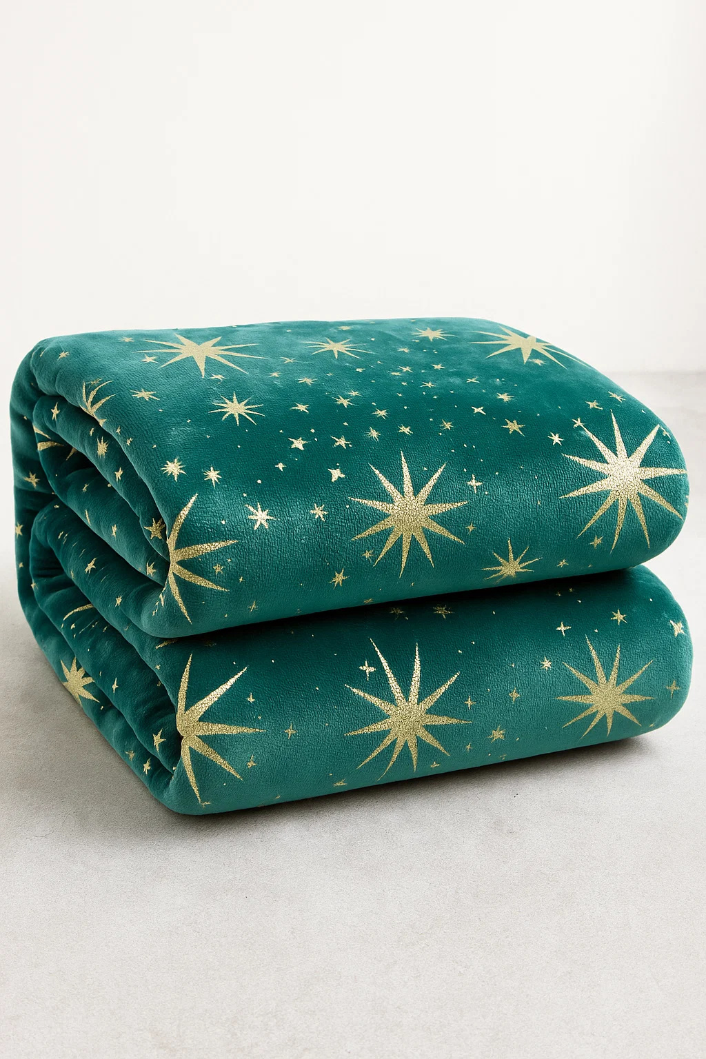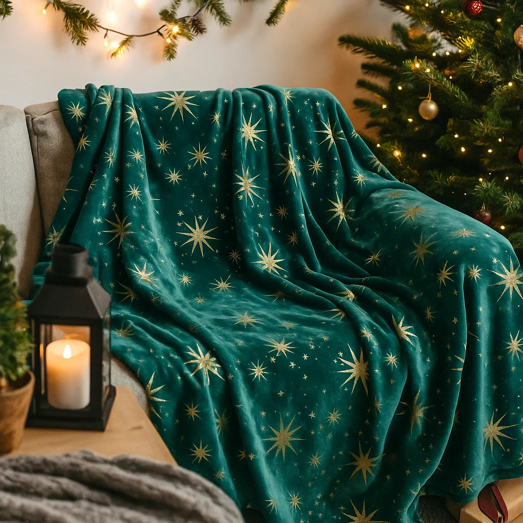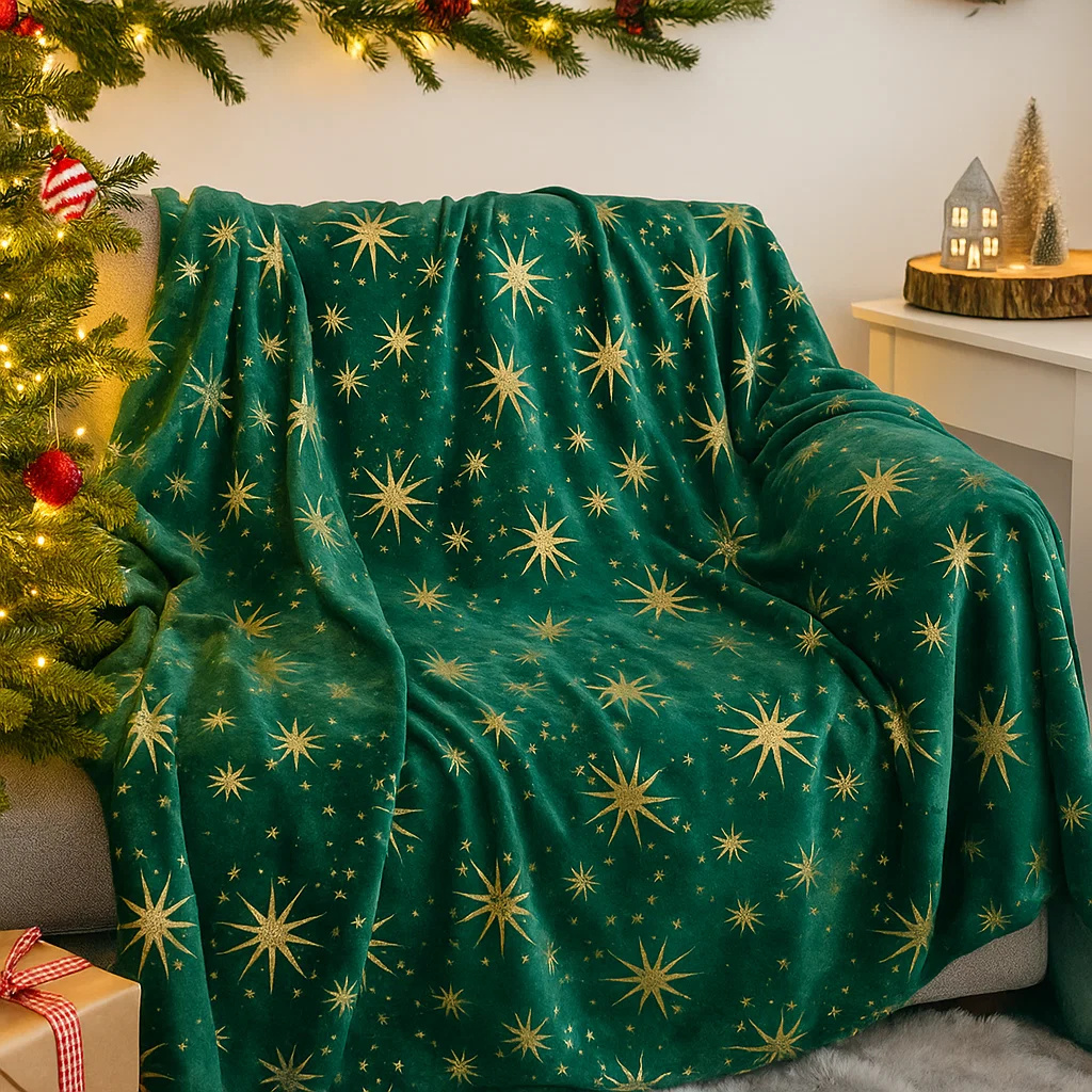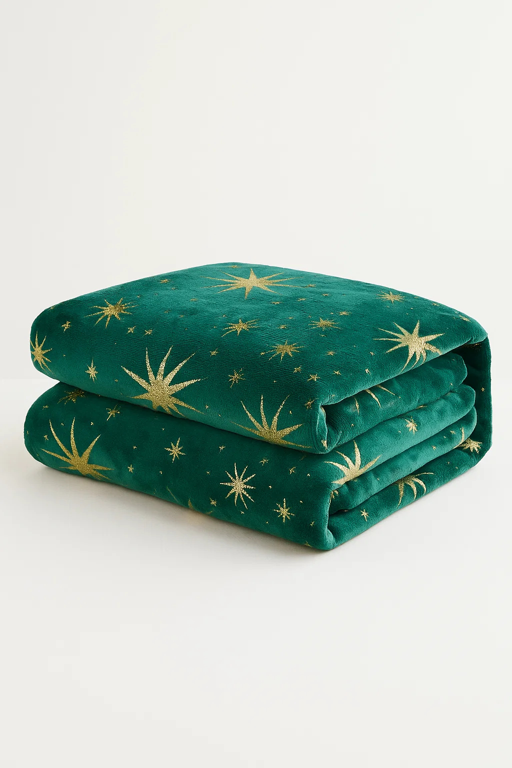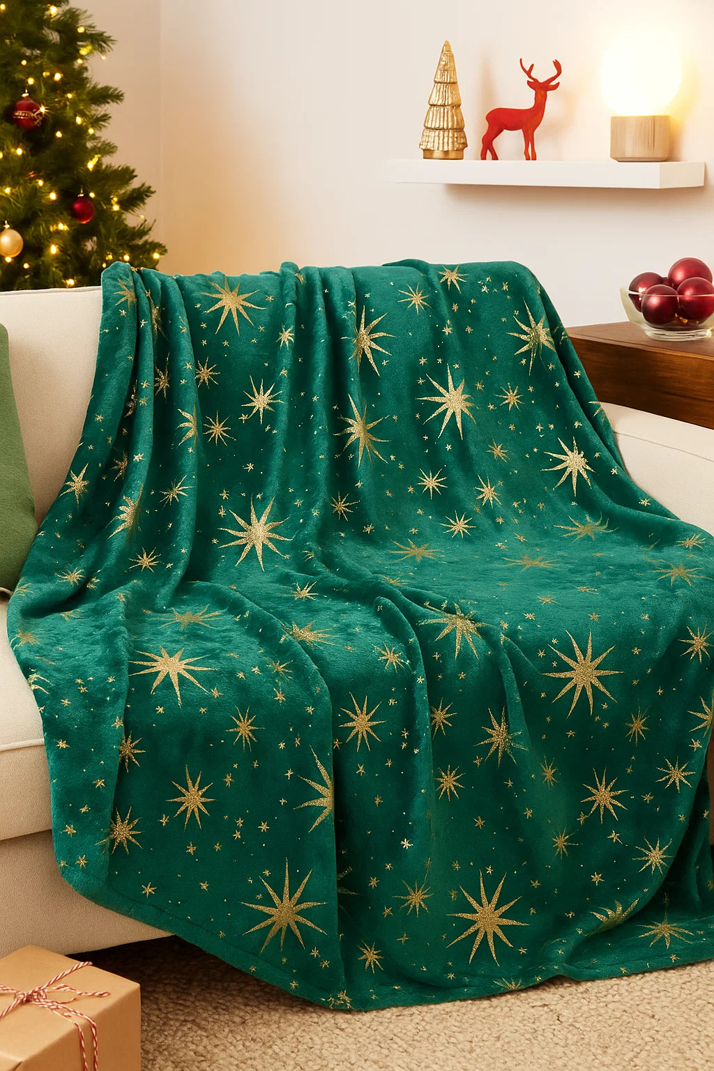 Koc świąteczny pluszowy w złote gwiazdki 160x200 butelkowy zielony