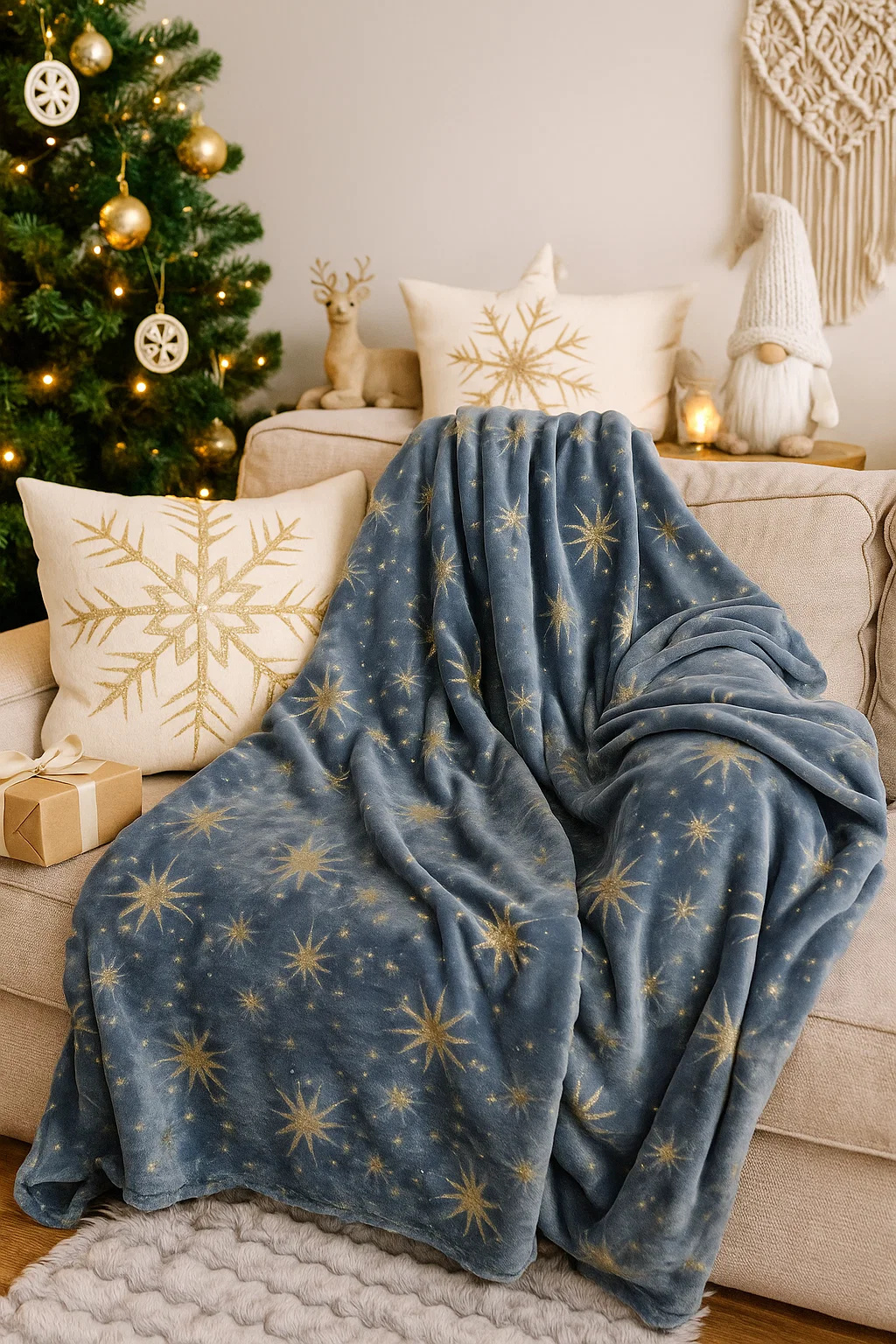 Koc jest wykonany z miękkiej, przyjemnej w dotyku mikrofibry, która zapewnia ciepło i wygodę. Jest to idealny dodatek do wieczornego relaksu przy kominku lub do przytulania się na kanapie podczas oglądania ulubionych filmów świątecznych.
