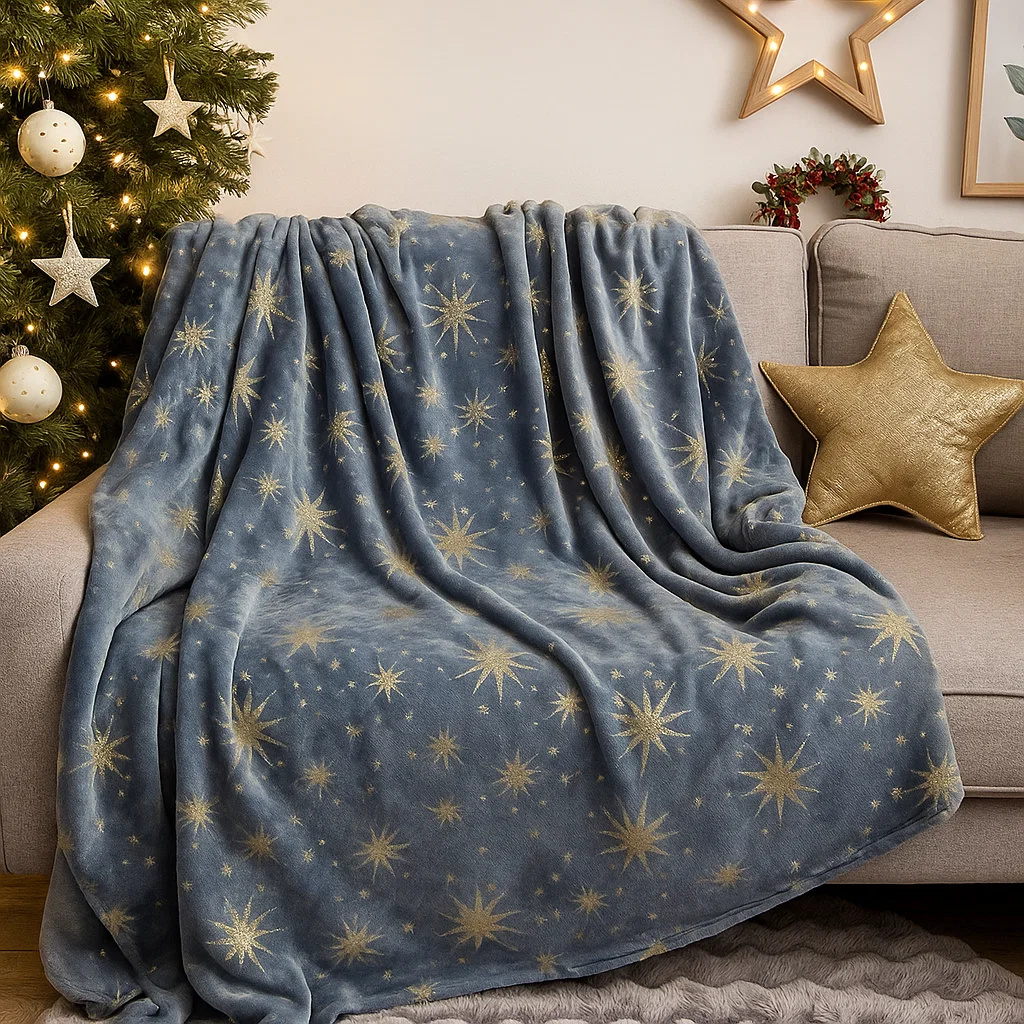 Koc świąteczny pluszowy w złote gwiazdki 160x200 ciemny szary