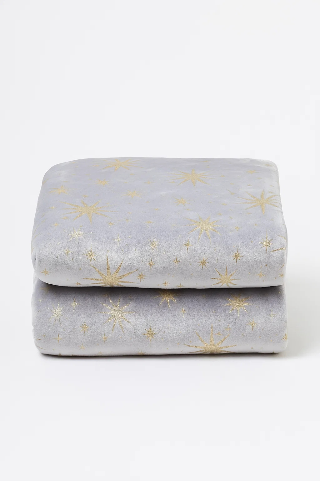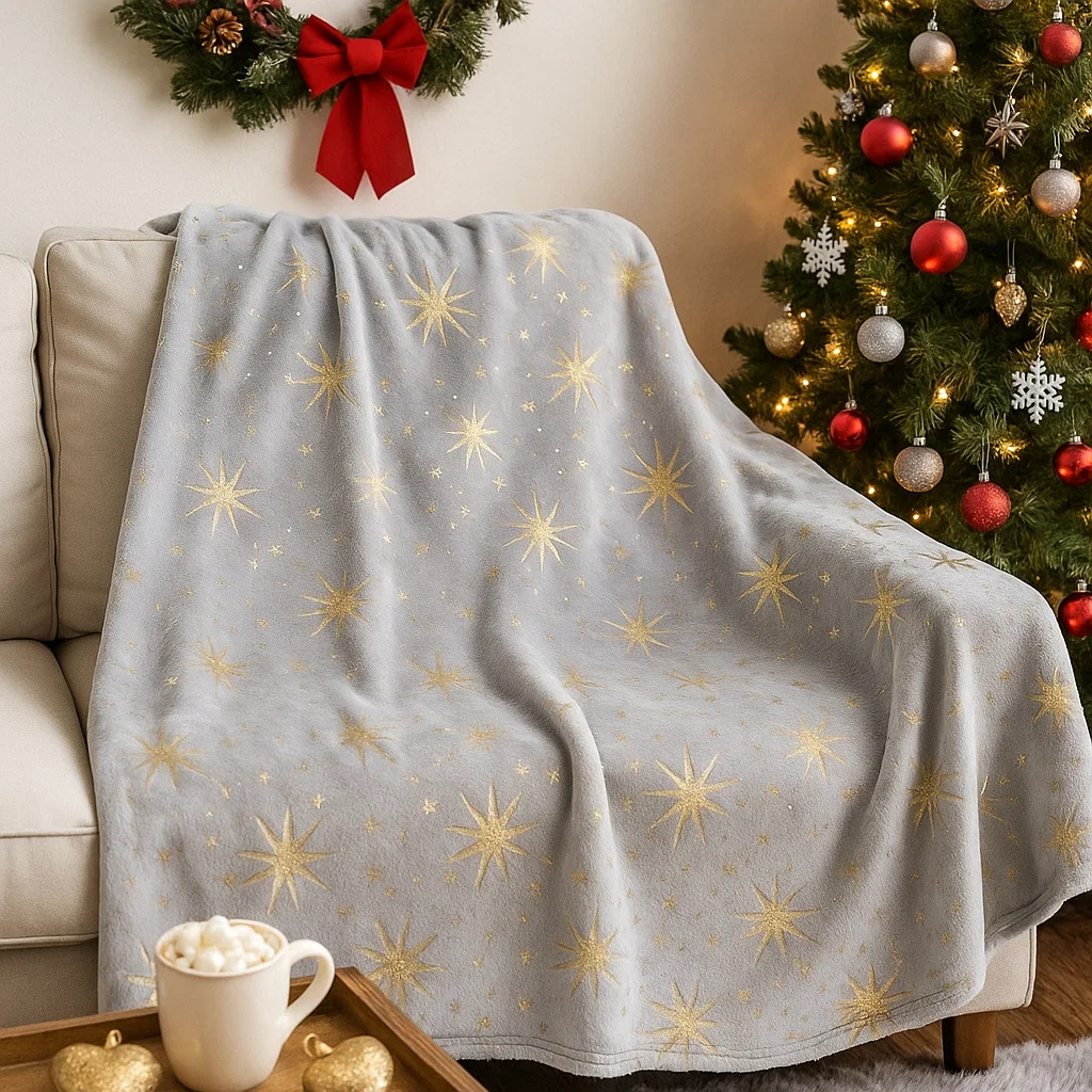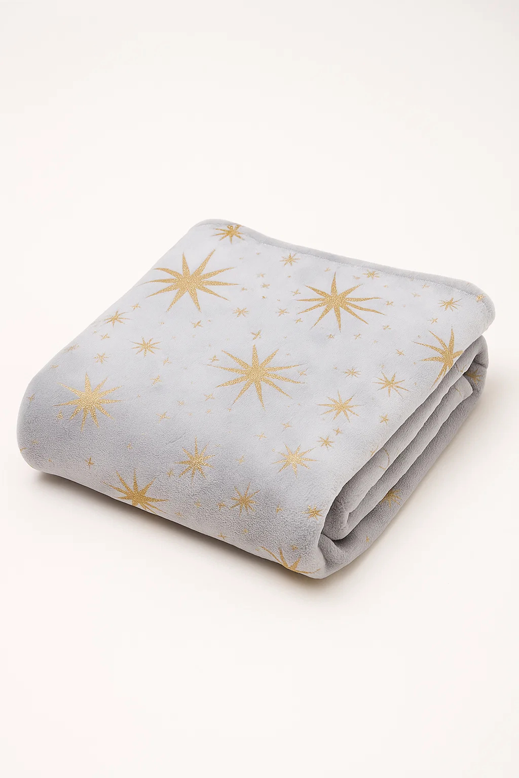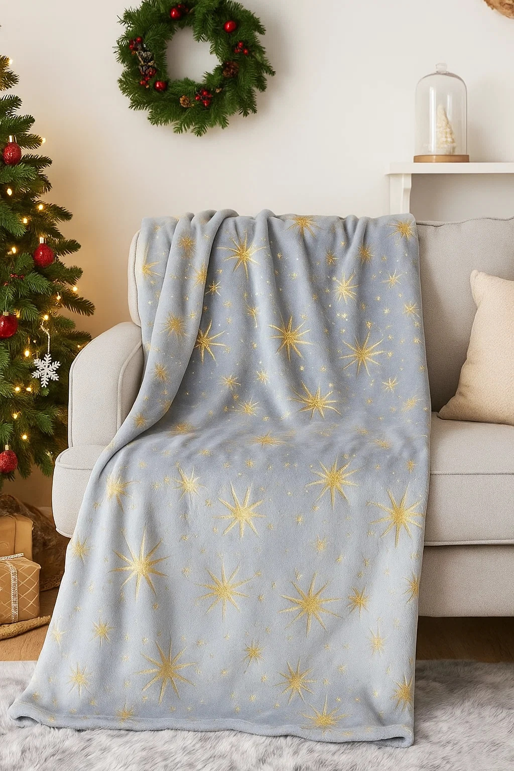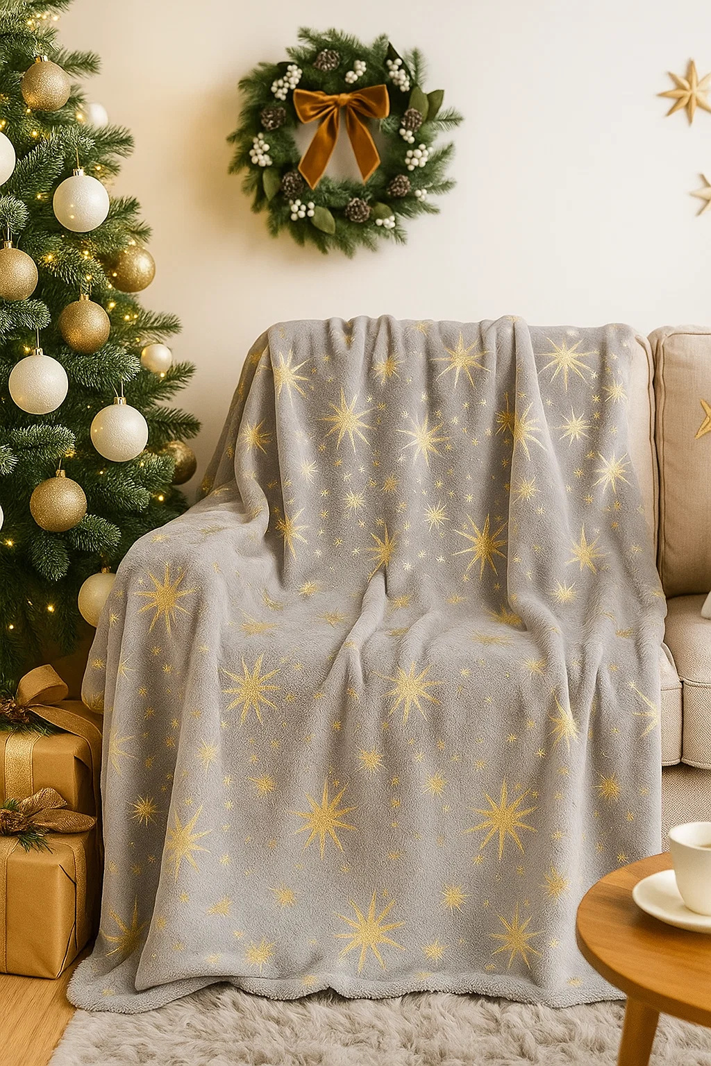Koc świąteczny pluszowy w złote gwiazdki 160x200 jasny szary
