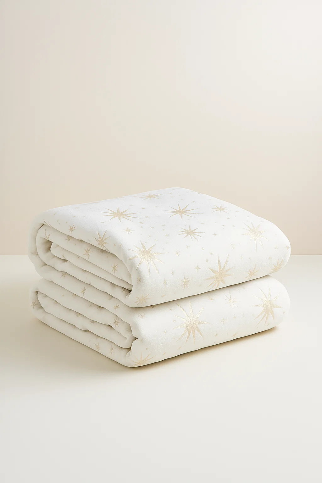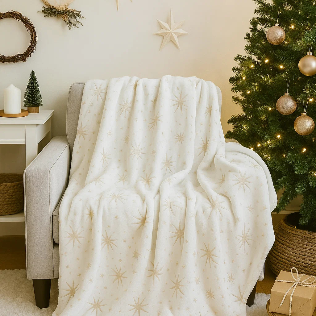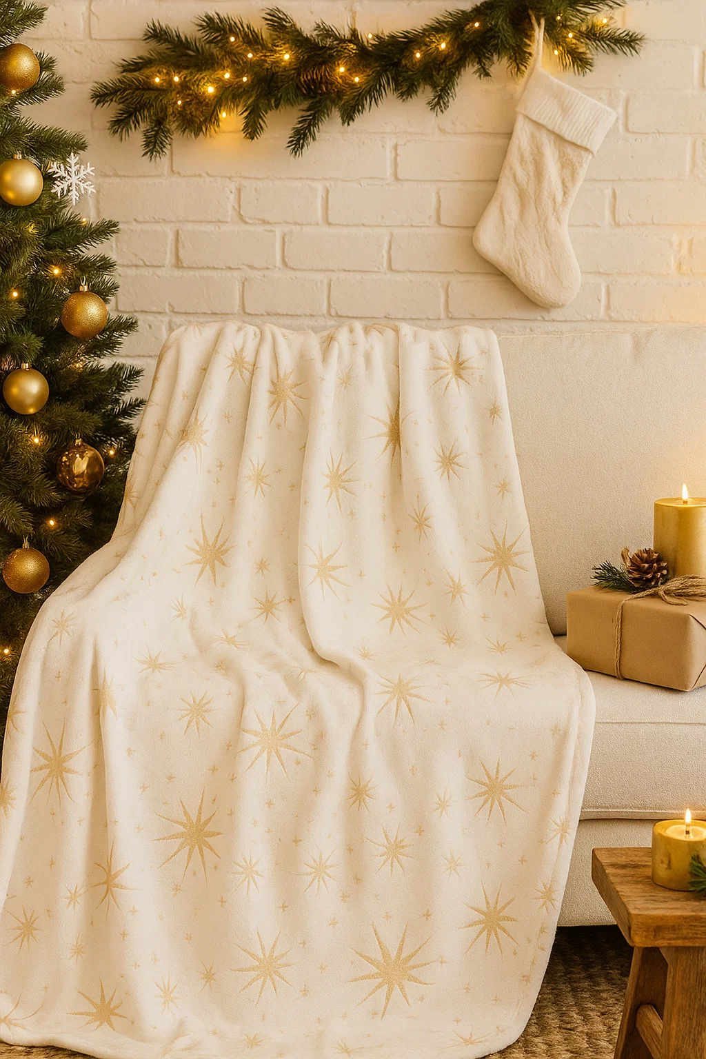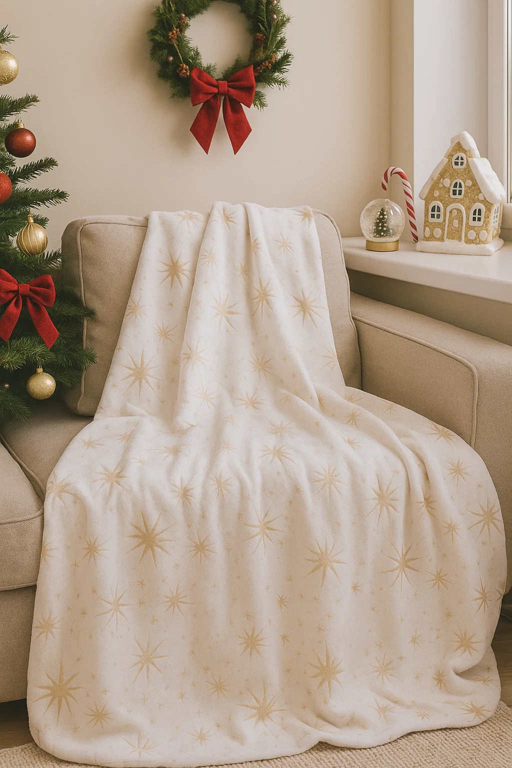 - Mięciutki koc narzuta z mikrofibry, elegancko wykończony i ciepły, idealny na chłodne zimowe wieczory 160x200 świąteczny kremowy we wzór gwiazdek
