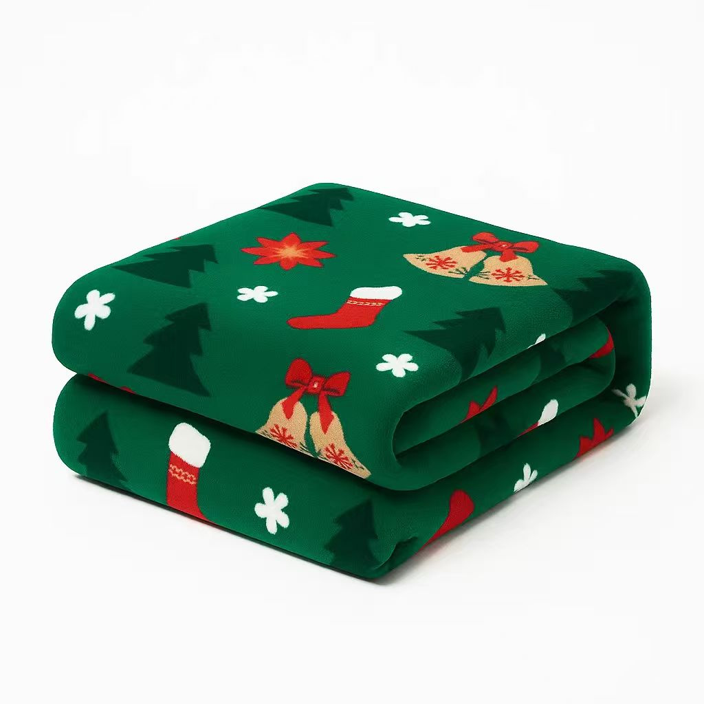 Koc świąteczny zielony w choinki, śnieżynki, dzwonki 160x200