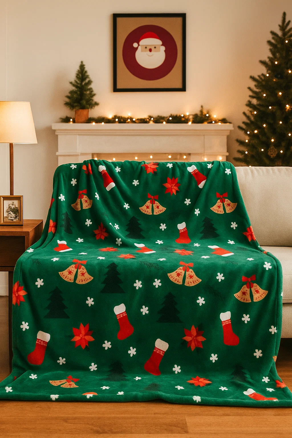 • Mięciutki koc narzuta z mikrofibry, elegancko wykończony i ciepły, idealny na chłodne zimowe wieczory 160x200 świąteczny ciemny zielony w choinki, śnieżynki, dzwoneczki, świąteczne skarpety na prezenty, zimowy