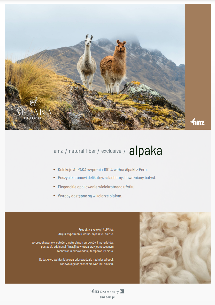 Kolekcja ALPAKA charakteryzuje się doskonałymi właściwościami termoregulacyjnymi oraz zdolnością do wchłaniania wilgoci i zapewniania optymalnej temperatury podczas snu, co zmniejsza ryzyko przegrzania. Wełna hamuje rozwój roztoczy i drobnoustrojów. Nie zawiera lanoliny, czyli sebum wytwarzanego przez skórę, co sprawia, że nie przyciąga kurzu. Miękką wełnę pokrywa batyst bawełniany. To tkanina o bardzo gęstym splocie, utkana z najwyższej jakości przędzy bawełnianej. Jest niezwykle miękka, dzięki czemu kołdry i poduszki z kolekcji ALPAKA są tak otulające. Struktura tkaniny zapewnia przewiewność oraz szybkie oddawanie wilgoci do otoczenia.