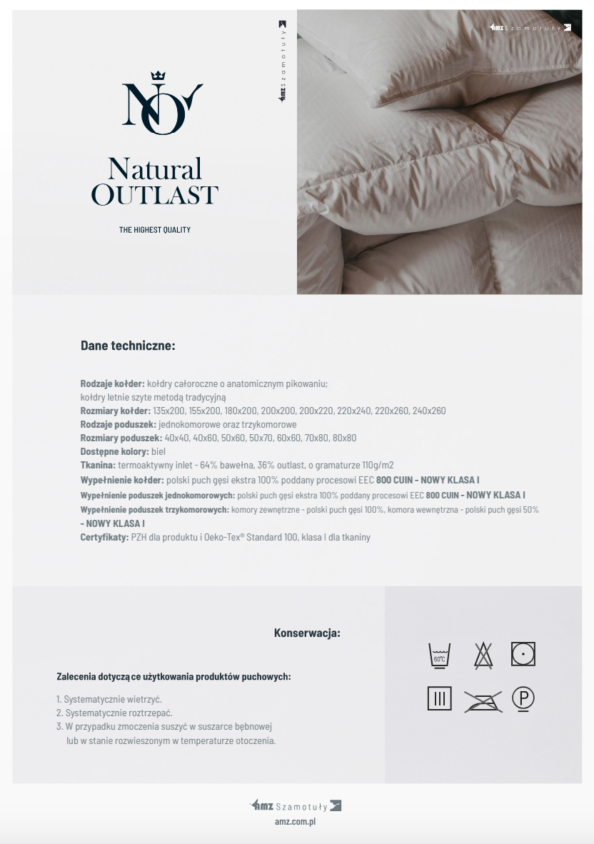 • Ekskluzywne puchowe kołdry i poduszki pokryte termoaktywną tkaniną bawełnianą z domieszką OUTLAST.