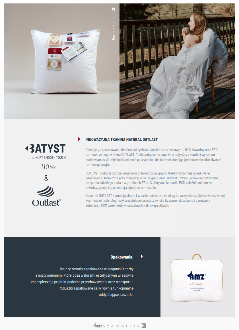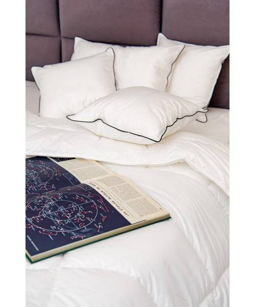 Termoaktywna kołdra całoroczna wypełniona włóknem OUTLAST. To zaawansowane technologicznie rozwiązanie tworzy korzystny mikroklimat, zapobiegając przegrzewaniu się i poceniu – ograniczając tym samym warunki do rozwoju drobnoustrojów. Włókno OUTLAST stworzone zostało pierwotnie na potrzeby kombinezonów kosmicznych NASA. Doceniono jego zdolność do optymalizacji temperatury organizmu podczas snu – zależnie od potrzeb może chłodzić, grzać lub być neutralne. Jako pokrycie kołdry zastosowano najwyższej jakości bawełnianą tkaninę o splocie batystowym, która zapewnia miękkość i delikatność. Materiały użyte do produkcji posiadają certyfikat Oeko-Tex. Kołdra jest bezpieczna dla alergików i zapewnia komfortowe warunki do snu – w idealnie dostosowanych warunkach termicznych.
