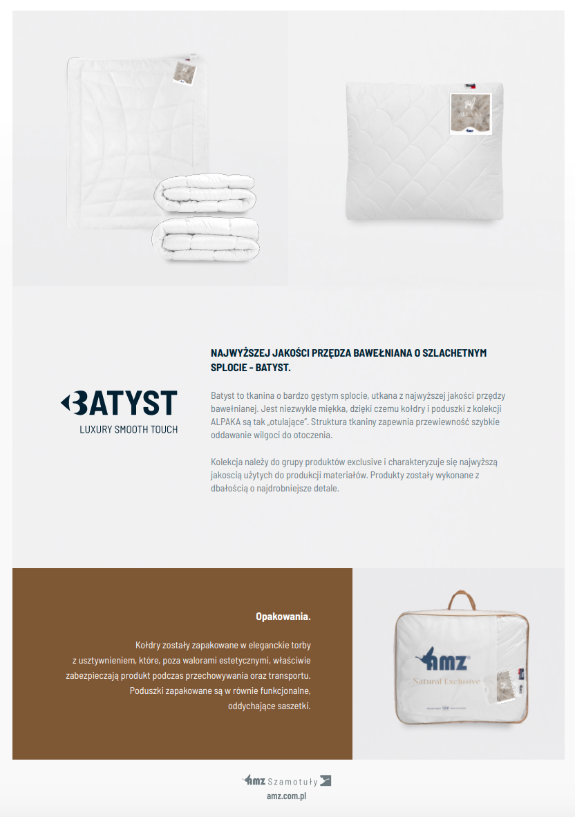 Kolekcja ALPAKA charakteryzuje się doskonałymi właściwościami termoregulacyjnymi oraz zdolnością do wchłaniania wilgoci i zapewniania optymalnej temperatury podczas snu, co zmniejsza ryzyko przegrzania. Wełna hamuje rozwój roztoczy i drobnoustrojów. Nie zawiera lanoliny, czyli sebum wytwarzanego przez skórę, co sprawia, że nie przyciąga kurzu. Miękką wełnę pokrywa batyst bawełniany. To tkanina o bardzo gęstym splocie, utkana z najwyższej jakości przędzy bawełnianej. Jest niezwykle miękka, dzięki czemu kołdry i poduszki z kolekcji ALPAKA są tak otulające. Struktura tkaniny zapewnia przewiewność oraz szybkie oddawanie wilgoci do otoczenia.