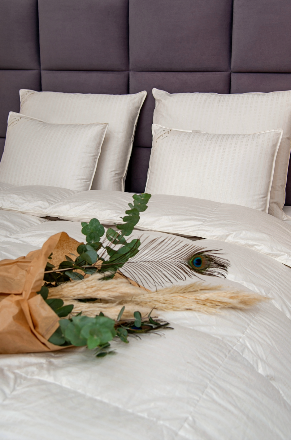 SILVER – ekskluzywna tkanina bawełniana o szlachetnym połysku z wplecioną nicią srebra, w połączeniu z najdelikatniejszym polskim puchem gęsim 90% tworzą zdrowe, wolne od roztoczy środowisko snu.
