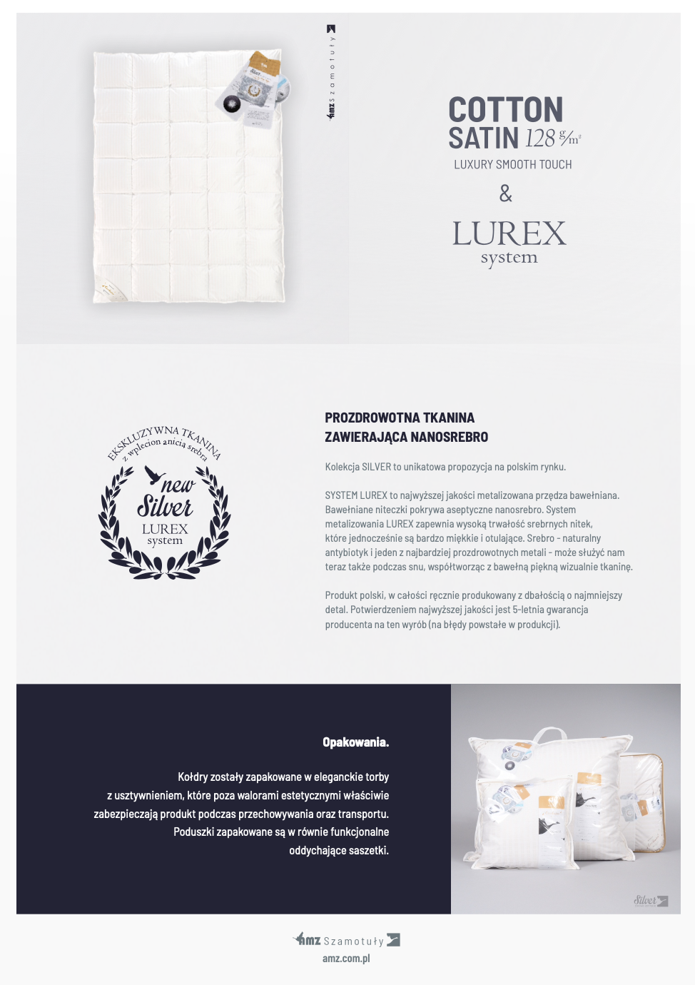SILVER – ekskluzywna tkanina bawełniana o szlachetnym połysku z wplecioną nicią srebra, w połączeniu z najdelikatniejszym polskim puchem gęsim 90% tworzą zdrowe, wolne od roztoczy środowisko snu.