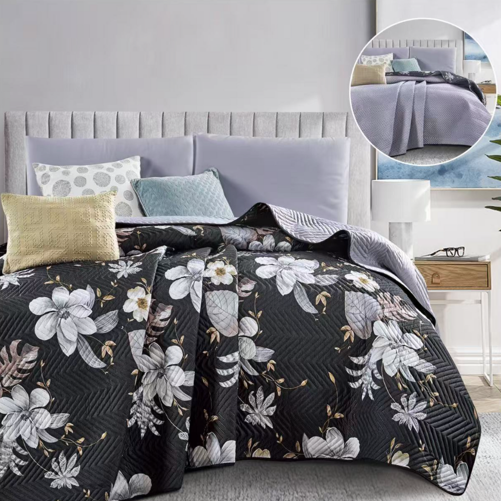 Opinie o Kołdra letnia narzuta ozdobna dwustronna DIAMOND 160x200 czarna w kwiaty - jasna szara nr416