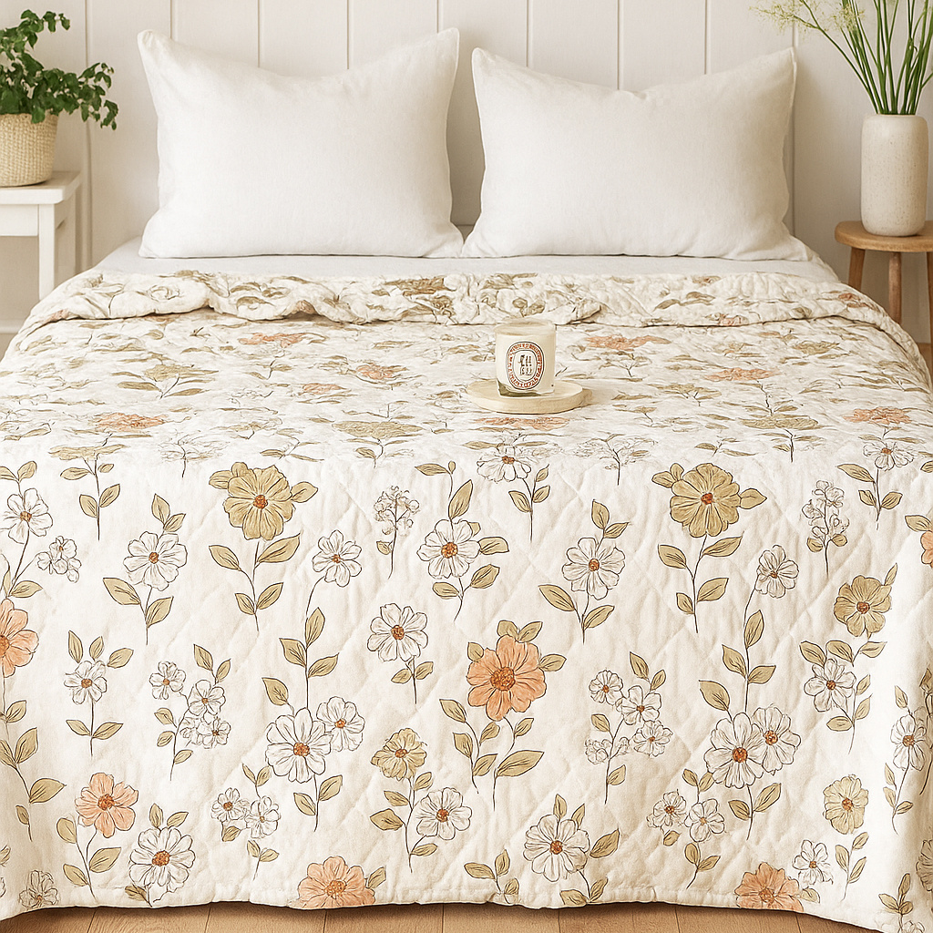Kołdra letnia pikowana narzuta biała w kwiaty 160x200 KH011