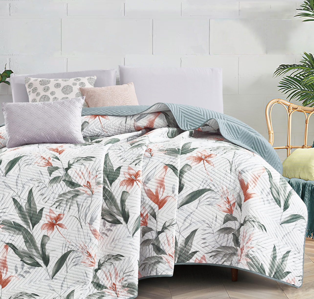 - Pikowana narzuta na duże łóżko z wypełnieniem, ozdobny wzór roślinny, dwustronna, dwukolorowa