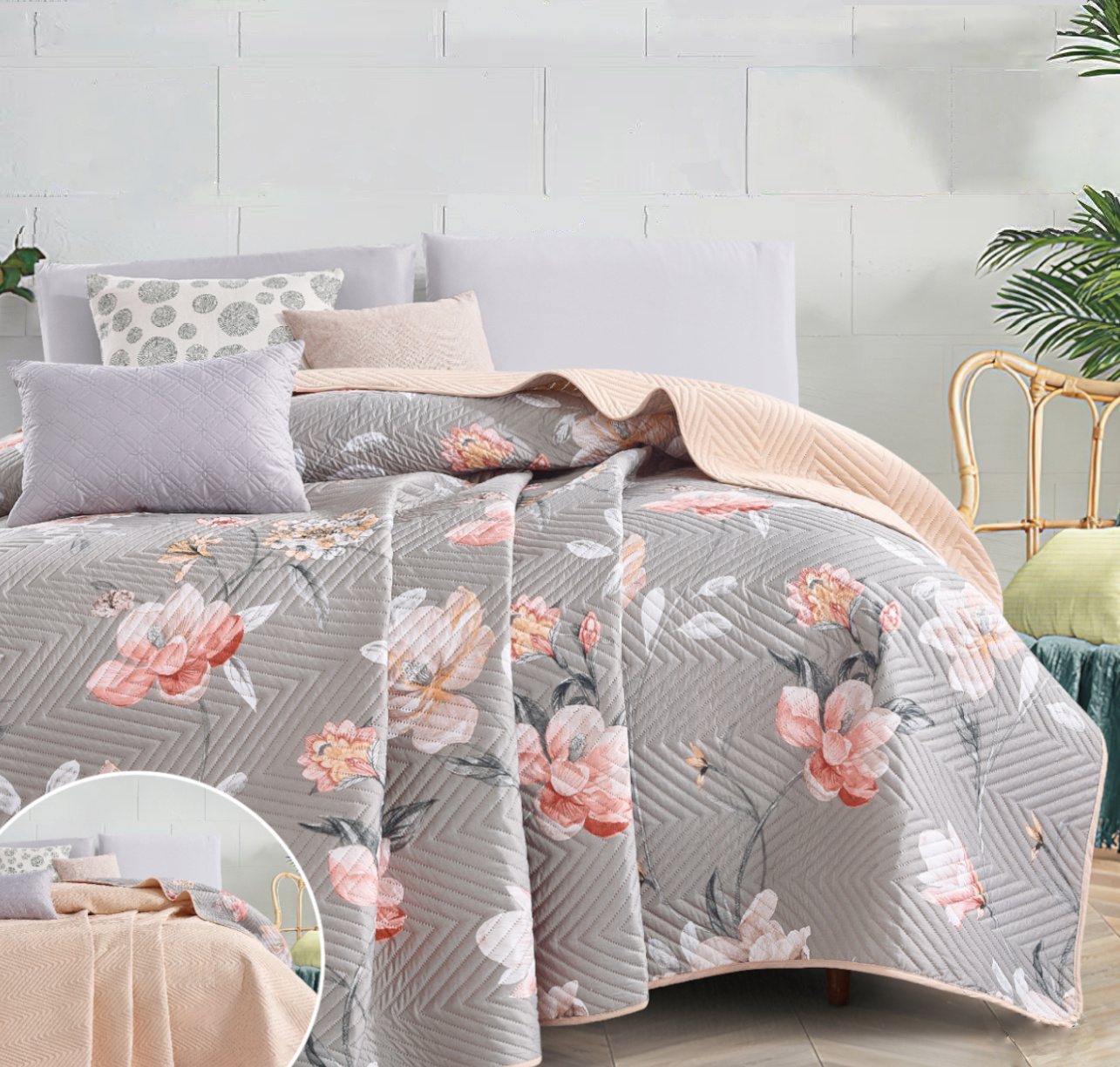 Narzuta ozdobna dwustronna DIAMOND 220x240 szara w kwiaty - beżowa F006