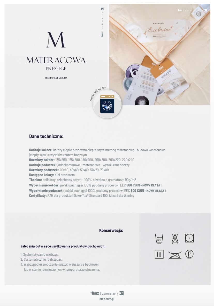 Linia MATERACOWA PRESTIGE to produkty wypełnione 100% naturalnym gęsim puchem polskiego pochodzenia, pokryte delikatną bawełną. Kolekcja wyróżnia się najcieplejszymi kołdrami z uwagi na większe ilości wypełnienia i unikatową konstrukcję szycia oraz wysokimi poduszkami.